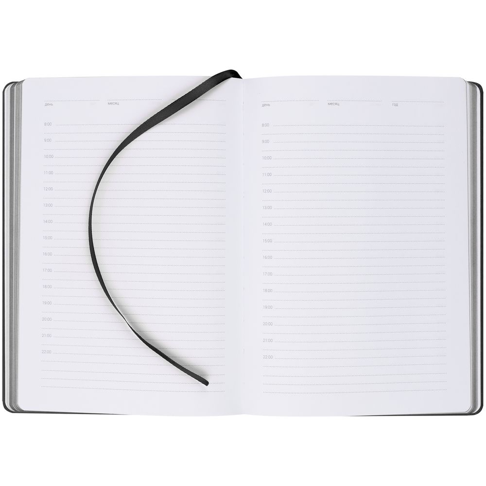 Ежедневник с твердой обложкой, выполнен из материала Latte, черный АА, обрез черного цвета, дополнен ляссе черного цвета и резинкой с металлическим шильдом.