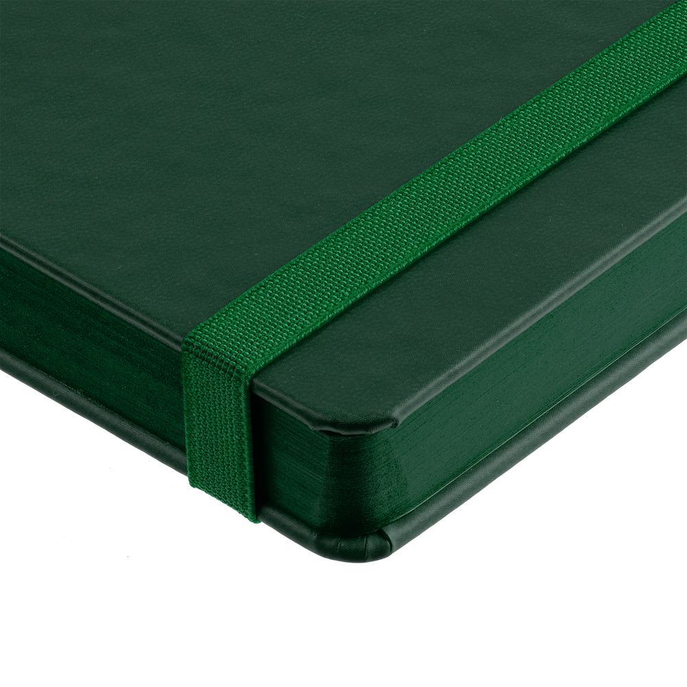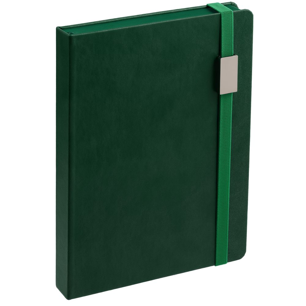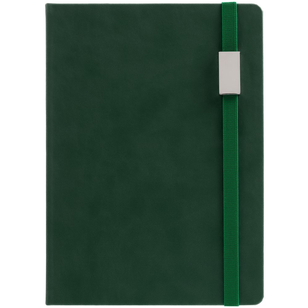 Ежедневник с твердой обложкой, выполнен из материала Latte, зеленый FF, обрез зеленого цвета, дополнен ляссе зеленого цвета и резинкой с металлическим шильдом.