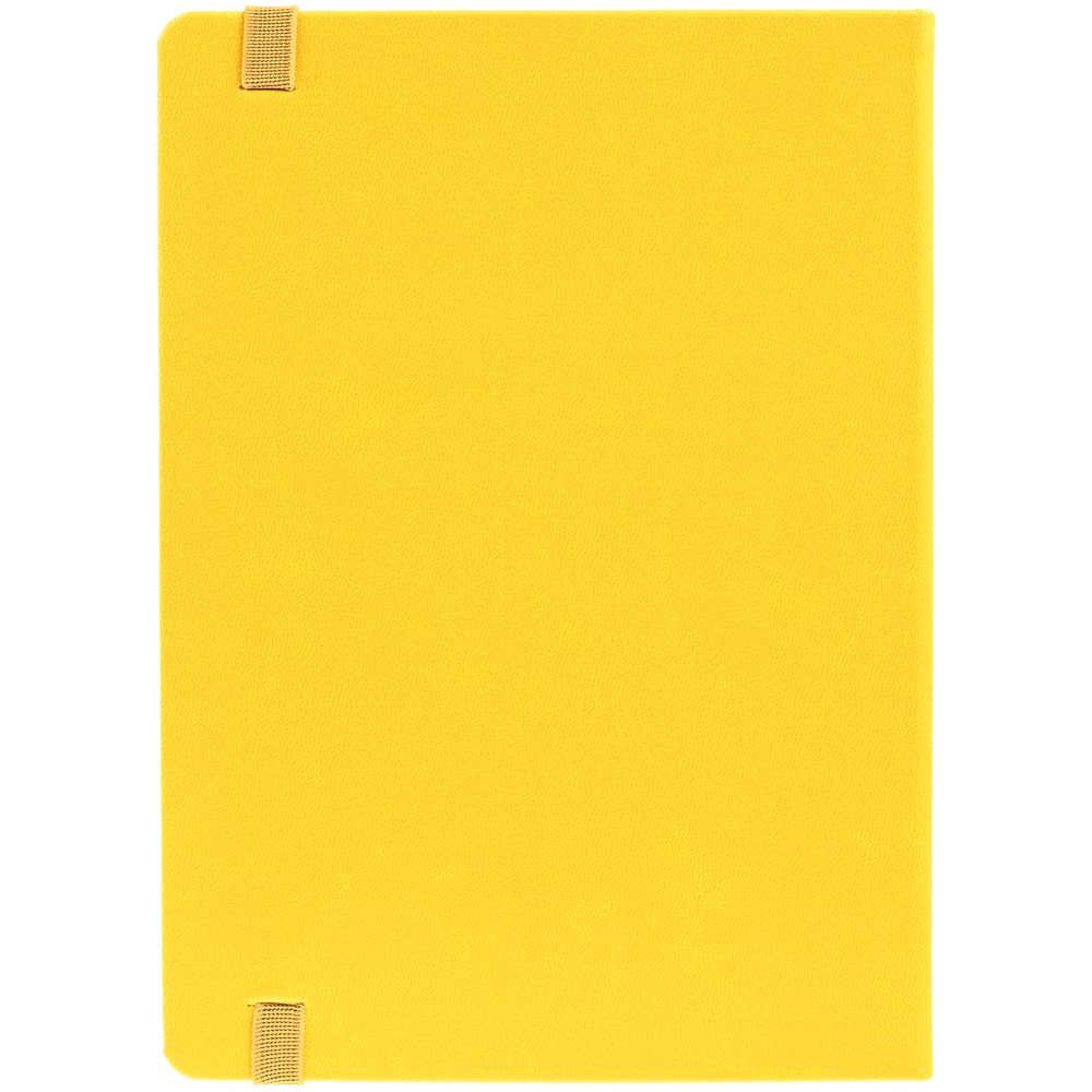 Ежедневник с твердой обложкой, выполнен из материала Latte, желтый КК, обрез зеленого цвета, дополнен ляссе желтого цвета и резинкой с металлическим шильдом.