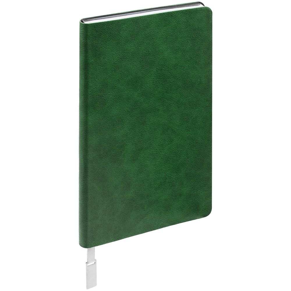 Ежедневник с гибкой обложкой, выполнен из материала Petrus, зеленый FF, дополнен серым ляссе с металлическим шильдиком.