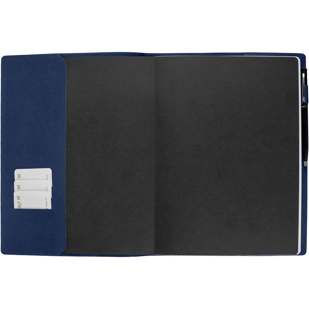 Ежедневник в суперобложке выполнен из материала La Fite, синий НН, дополнен ляссе и капталом черного цвета.
