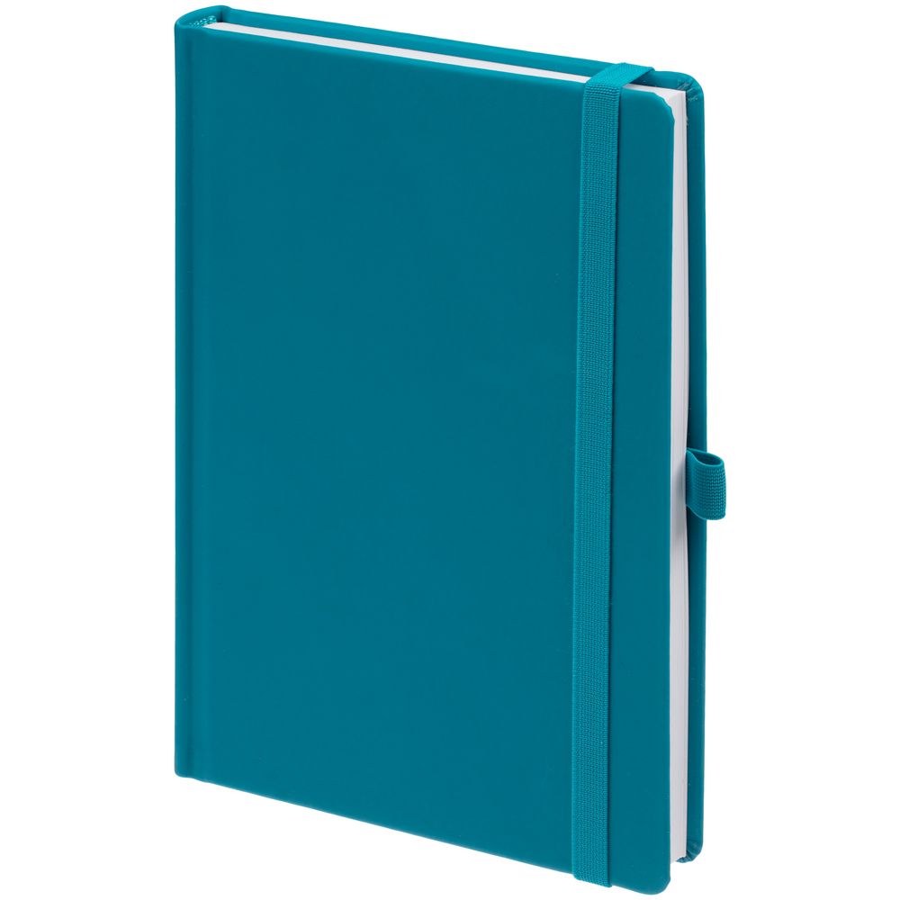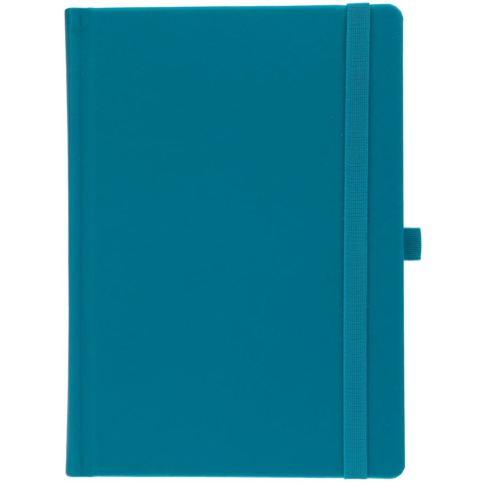 Ежедневник с твердой обложкой без поролона, выполнен из материала Soft Touch, цвет морской волны II, дополнен резинкой шириной 1 см, петлей-резинкой для ручки, капталом и ляссе темно-бирюзового цвета.