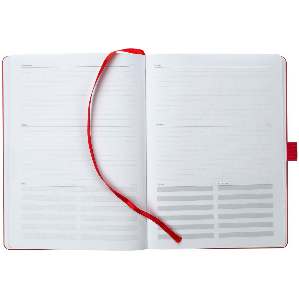 Еженедельник в твердой обложке выполнен из материала Nebraska, красный РР, дополнен резинкой, петлей для ручки и ляссе красного цвета.