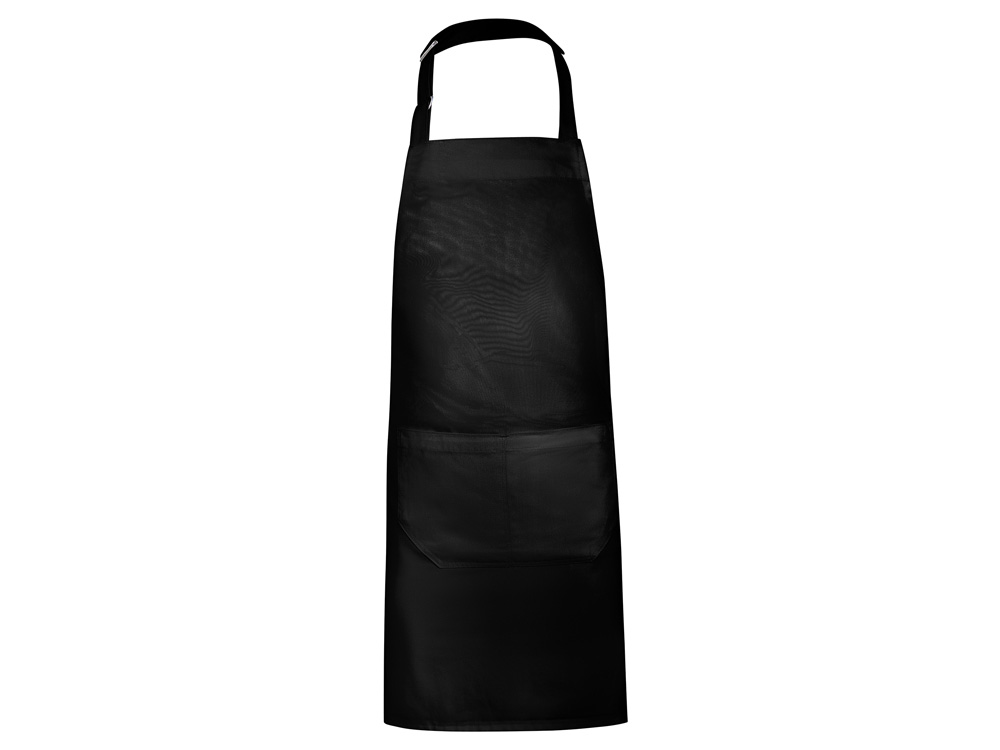 Длинный твиловый фартук из переработанного полиэстера и хлопка. Шейный ремешок с регулируемой застежкой. Завязки по бокам. Два передних кармана.