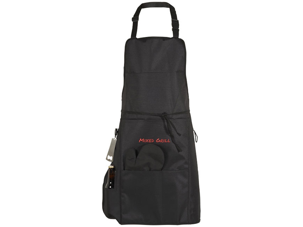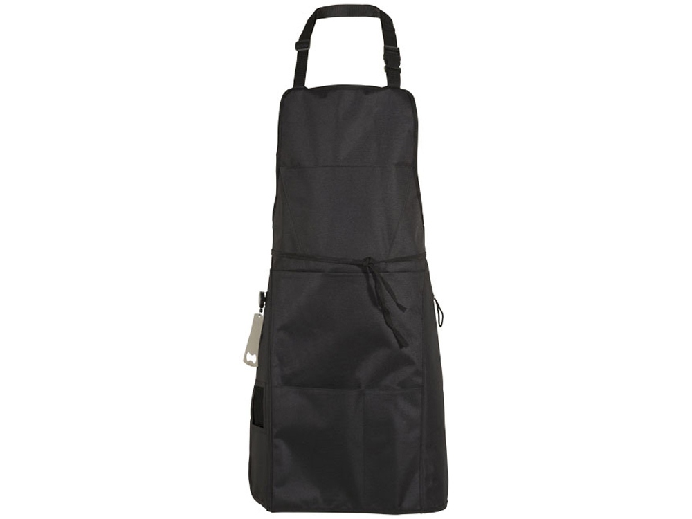 Фартук для гриля. Благодаря этому фартуку, ваши инструменты для гриля будут всегда под рукой. Изолированный карман для хранения напитков прохладными, отстегивающаяся открывалка, рукавичка для духовки и два передних кармана для размещения других инструментов для гриля.