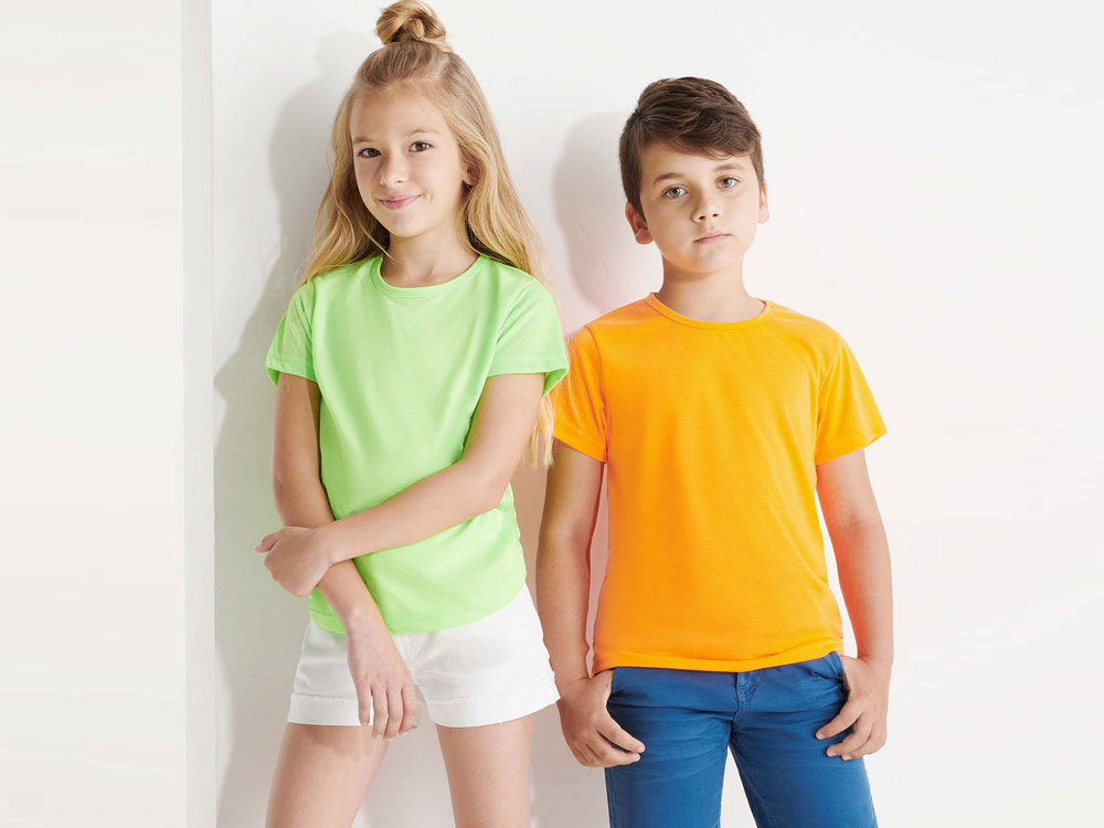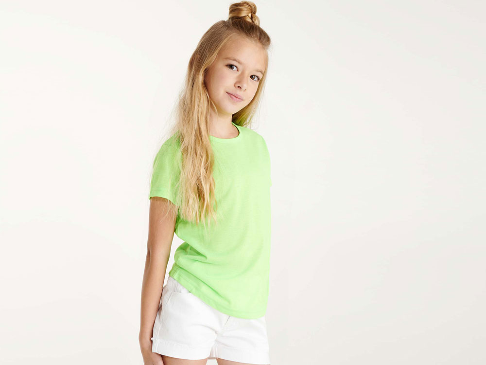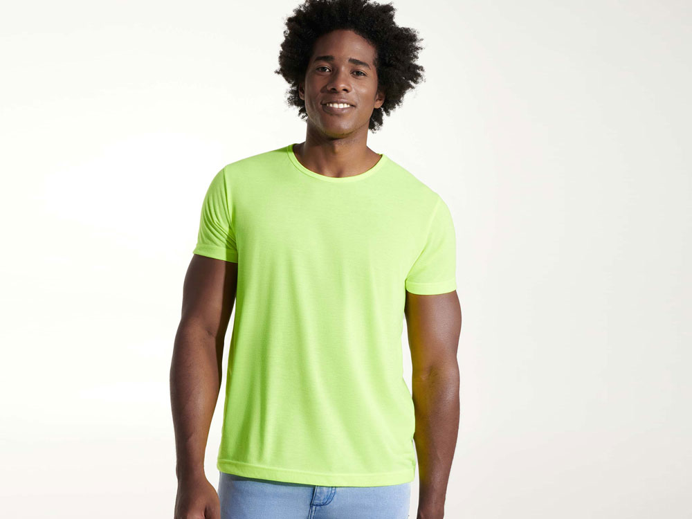 Футболка с коротким рукавом и круглым вырезом горловины. Модель в неоновых цветах выполнена из полиэстера, на ощупь напоминающего хлопок.