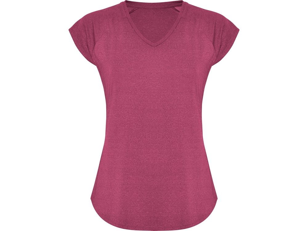 Спортивная женская футболка с коротким рукавом реглан. Вырез горловины V. Полотно из полиэстера на ощупь напоминающее хлопок. Приталенный силуэт.