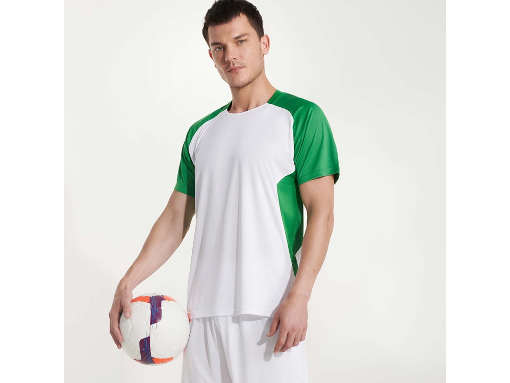 Спортивная футболка с коротким рукавом реглан. Круглый вырез горловины. Контрастные рукава и боковые вставки.