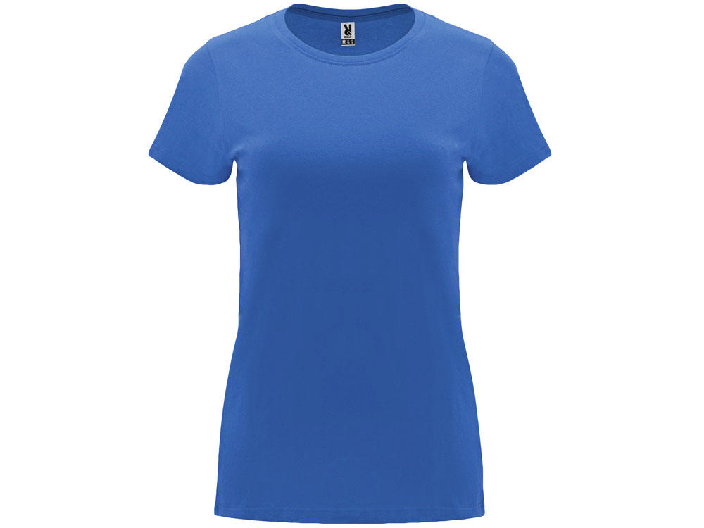 Женская приталенная футболка. Круглый вырез горловины обработан рибом 1х1. Шов горловины укреплен тесьмой.