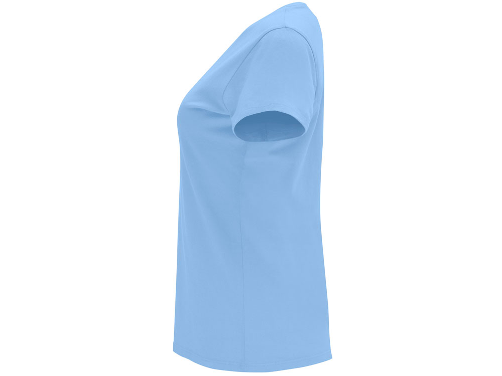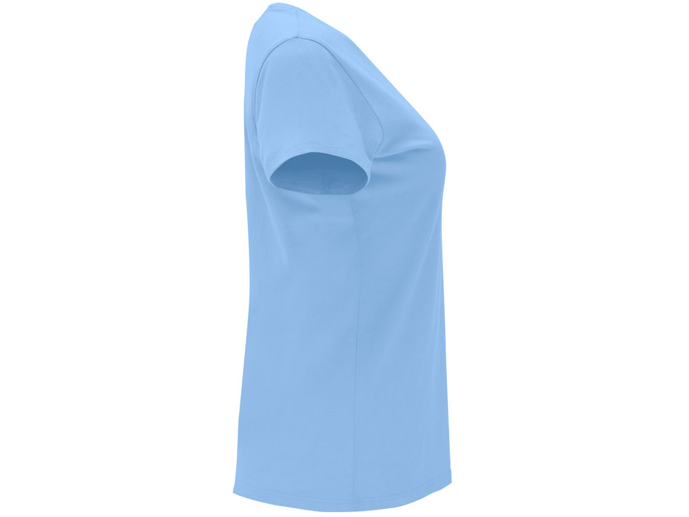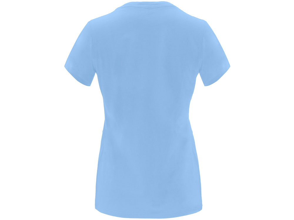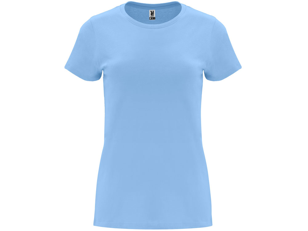 Женская приталенная футболка. Круглый вырез горловины обработан рибом 1х1. Шов горловины укреплен тесьмой.