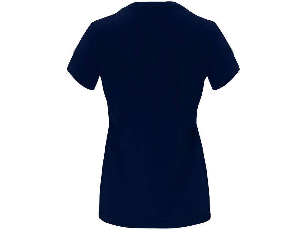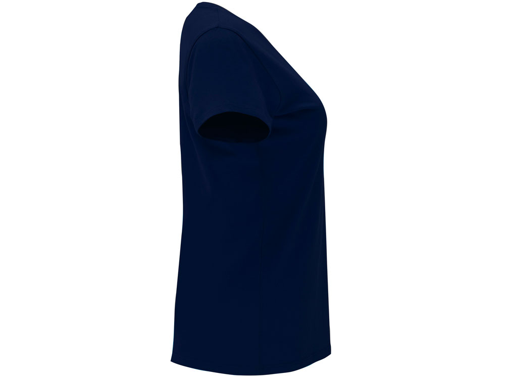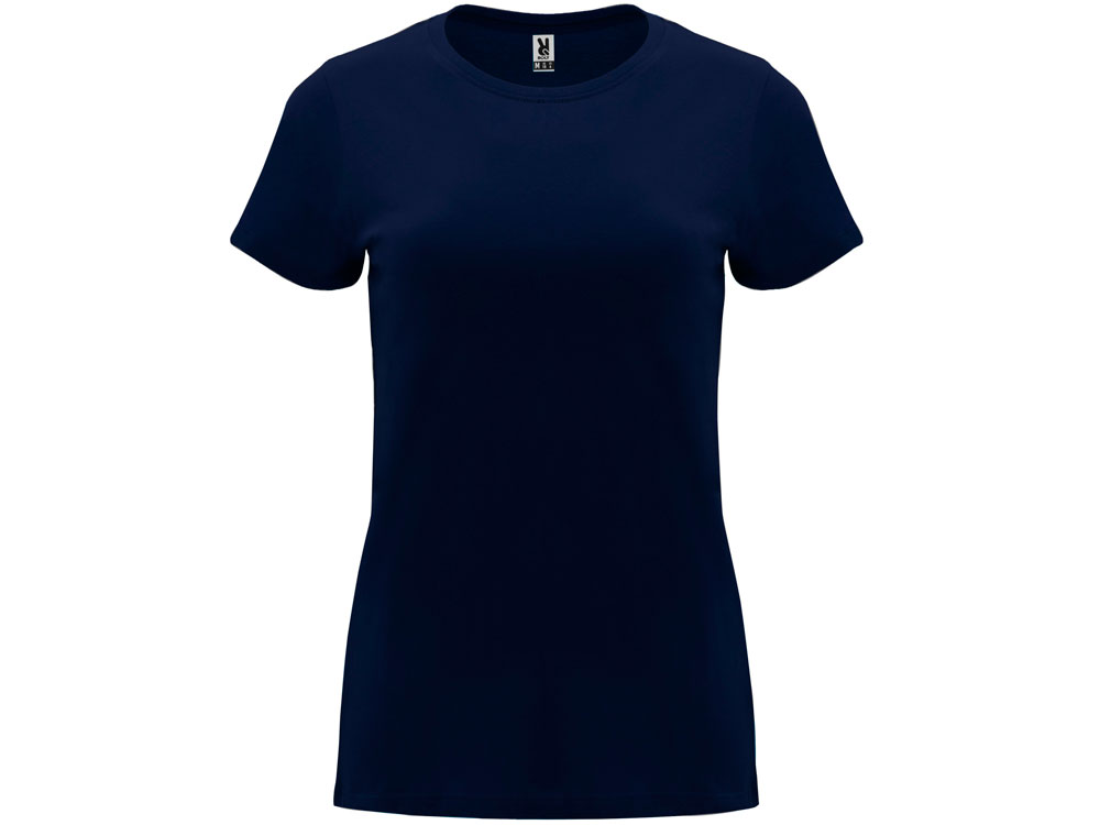 Женская приталенная футболка. Круглый вырез горловины обработан рибом 1х1. Шов горловины укреплен тесьмой.