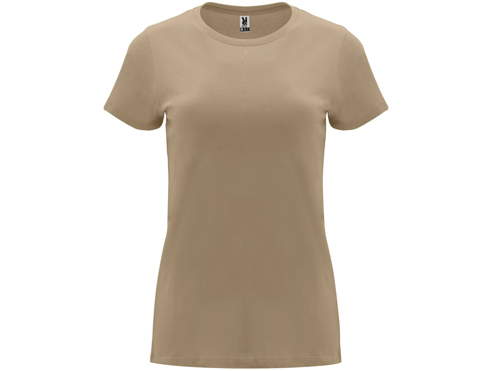 Женская приталенная футболка. Круглый вырез горловины обработан рибом 1х1. Шов горловины укреплен тесьмой.