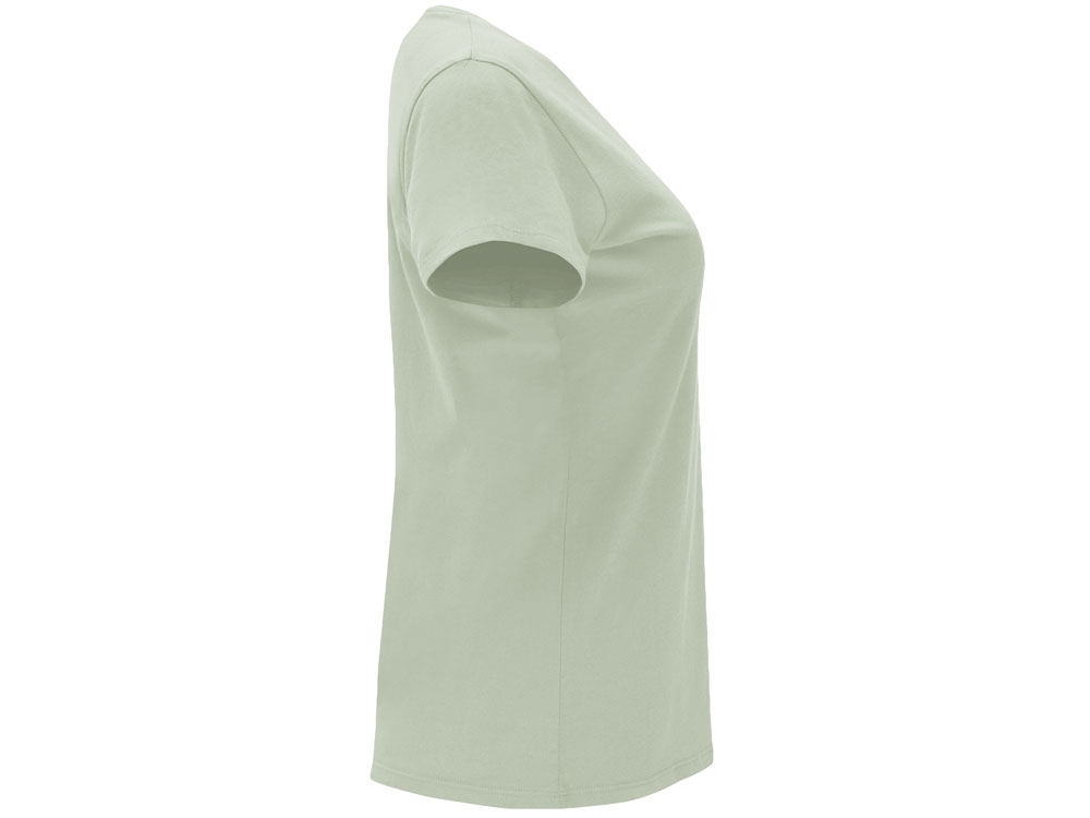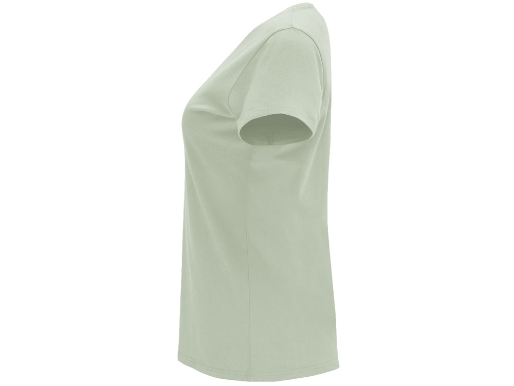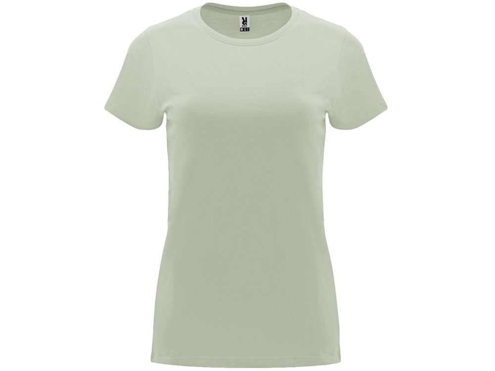 Женская приталенная футболка. Круглый вырез горловины обработан рибом 1х1. Шов горловины укреплен тесьмой.