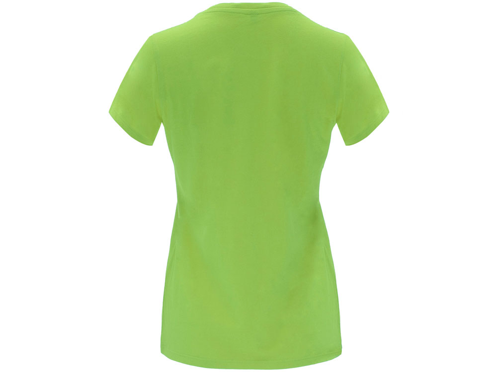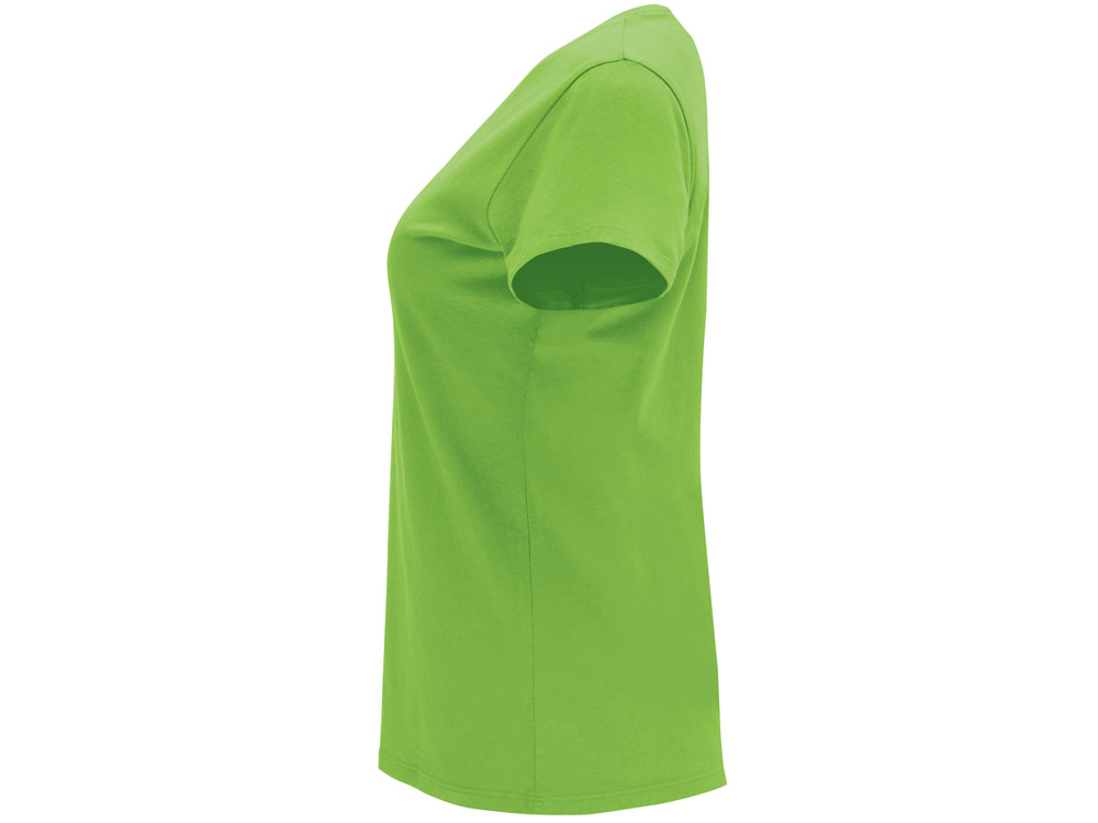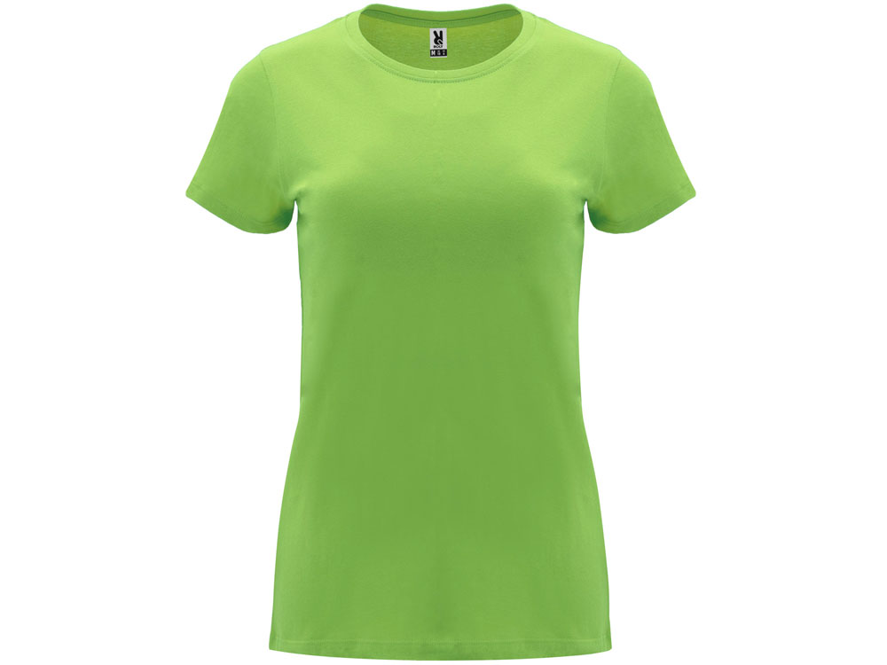 Женская приталенная футболка. Круглый вырез горловины обработан рибом 1х1. Шов горловины укреплен тесьмой.