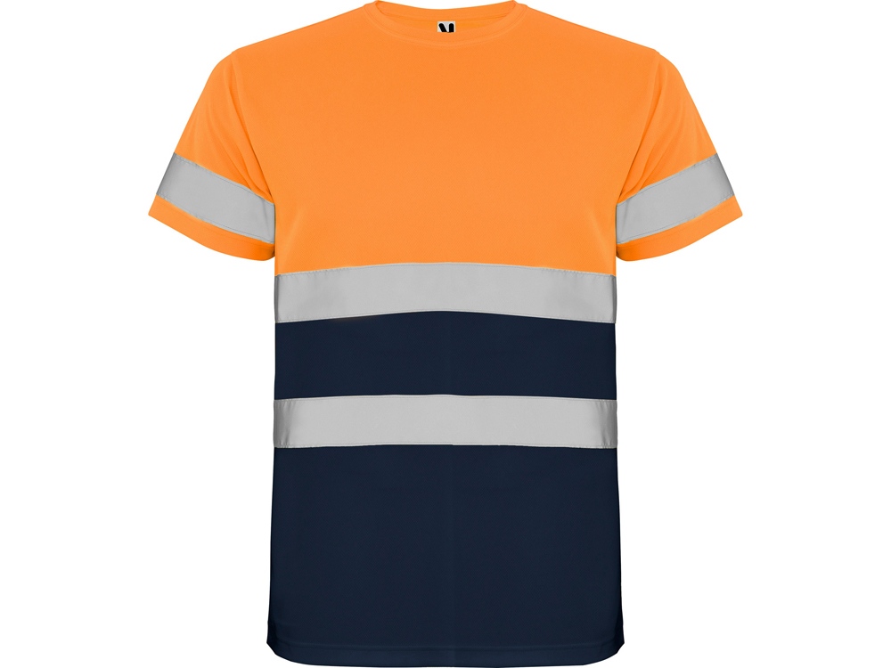 Футболка со светоотражающими элементами с короткими рукавами. Круглая горловина из той же ткани, с усиленными закрытыми швами на внутренней стороне горловины. Две горизонтальные светоотражающие полосы на туловище и одна светоотражающая полоса на рукавах.