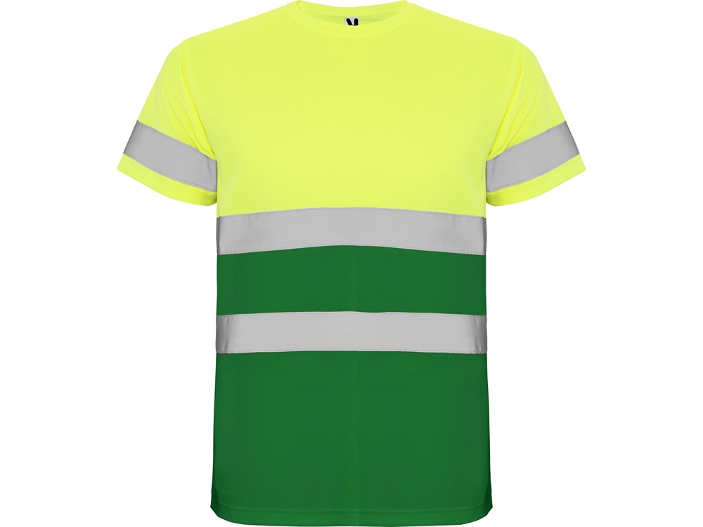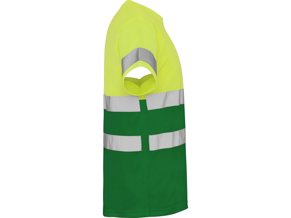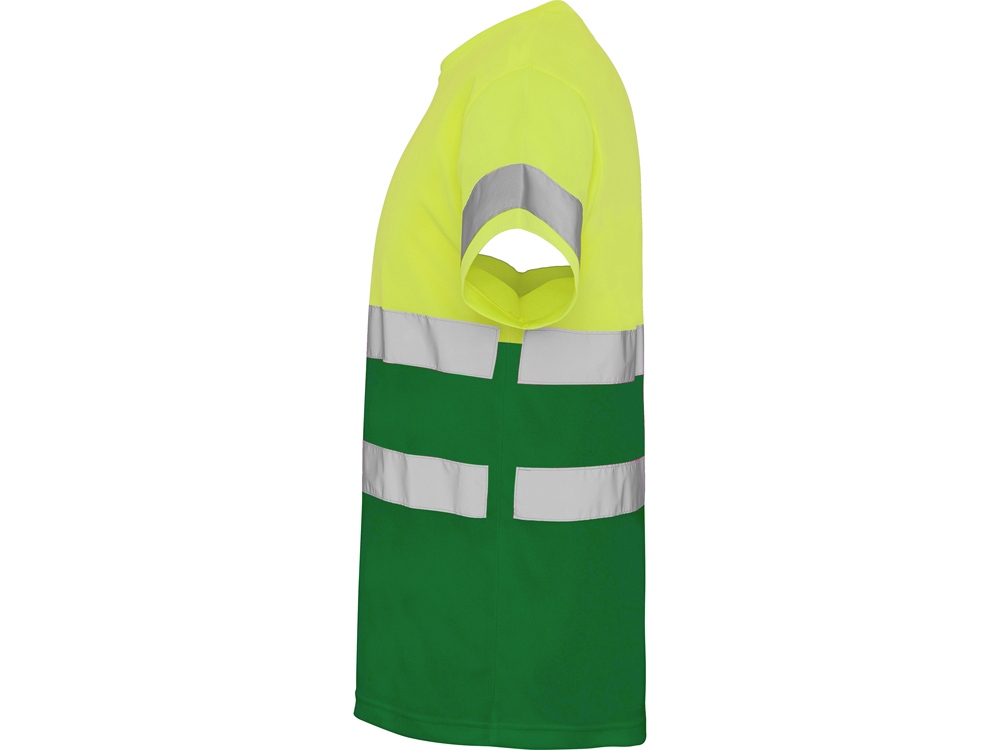 Футболка со светоотражающими элементами с короткими рукавами. Круглая горловина из той же ткани, с усиленными закрытыми швами на внутренней стороне горловины. Две горизонтальные светоотражающие полосы на туловище и одна светоотражающая полоса на рукавах.