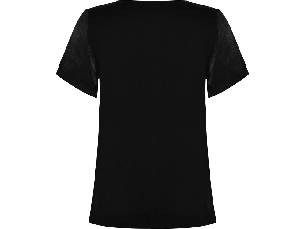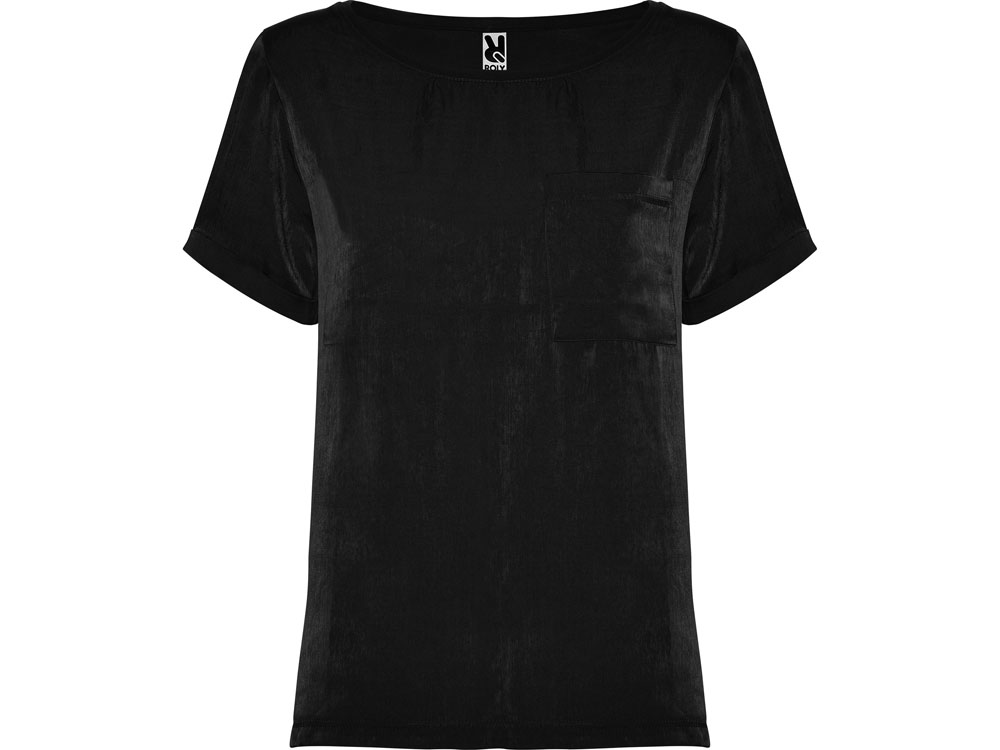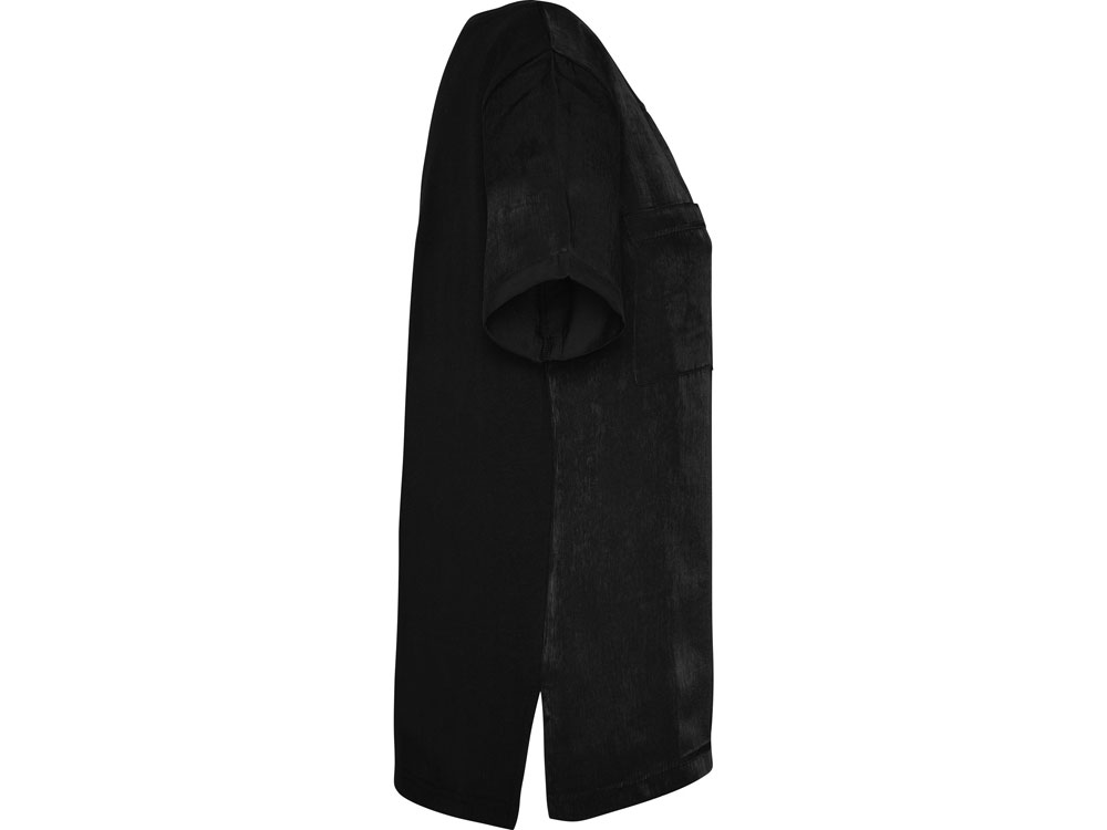 Женская футболка с коротким рукавом с расширенной горловиной. Накладной карман на груди слева. Спинка длиннее полочки. Разрезы в боковых швах.