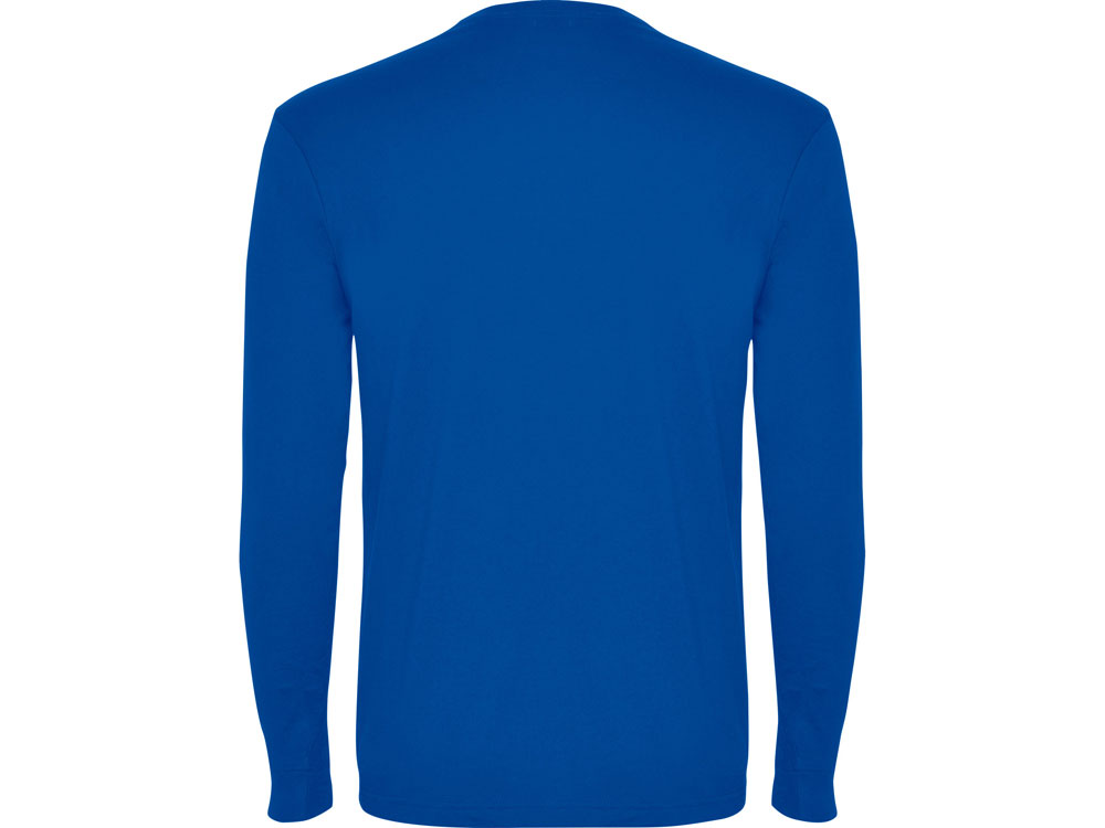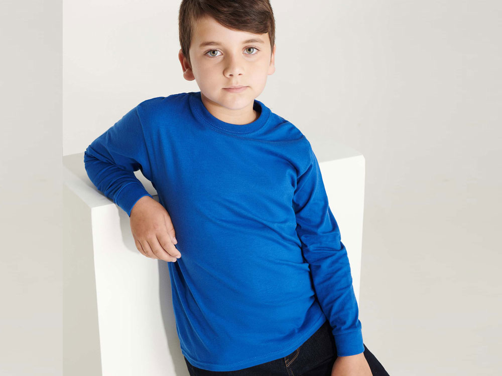 Детская футболка с длинным рукавом и боковыми швами. Круглый вырез горловины отделан рибом 1х1. Плечевые швы и горловина спинки усилены тесьмой.