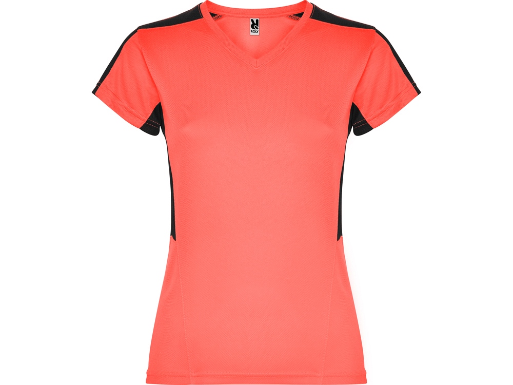 Женская футболка с коротким рукавом. V-образная горловина. Комбинация из 2 полотен контрастного цвета: структурное полотно на полочке и дышащая 3D сетка на плечах и боках.