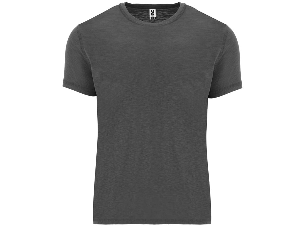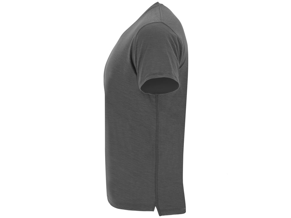 Мужская футболка с коротким рукавом из джерси с протяжками. Горловина отделана тем же полотном и отстрочена плоским швом, дополнительно укреплена тесьмой контрастного цвета. Боковые швы с отстрочкой плоским швом, с разрезом по низу, спинка немного длиннее полочки