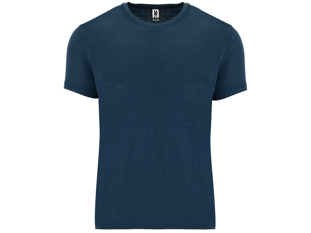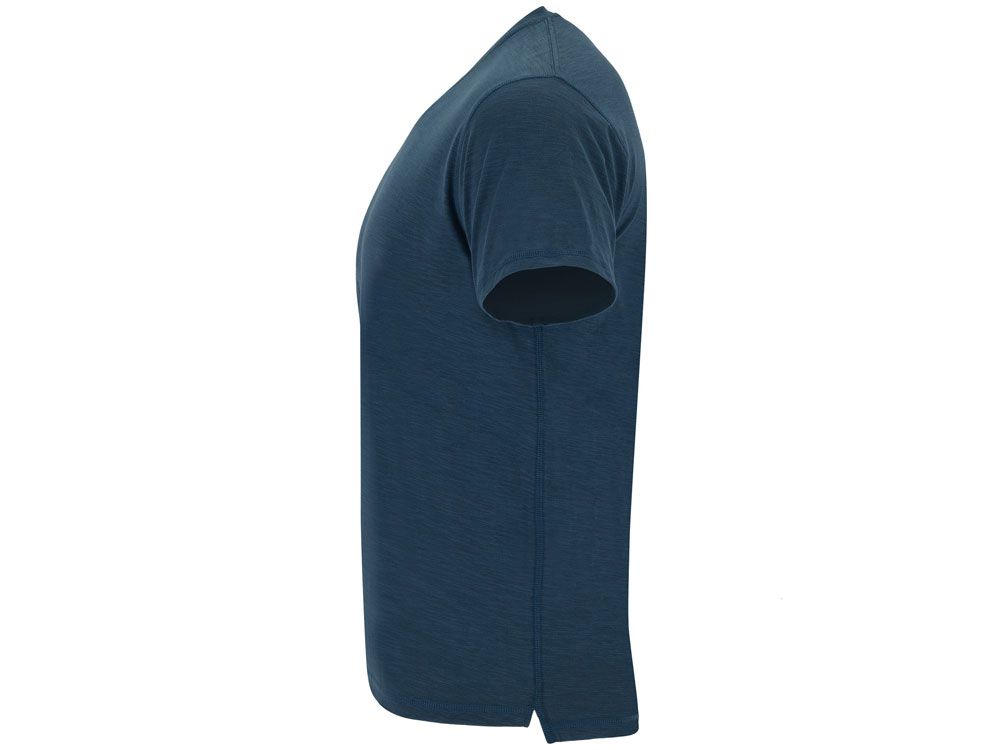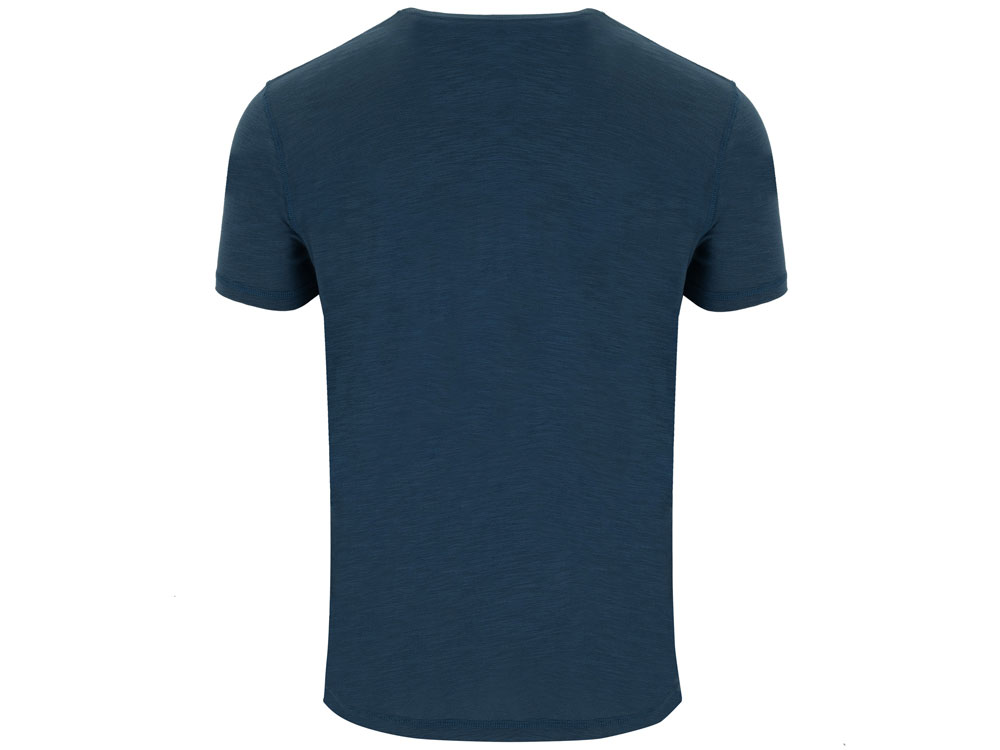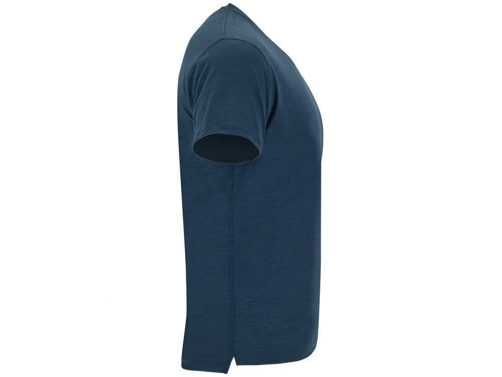 Мужская футболка с коротким рукавом из джерси с протяжками. Горловина отделана тем же полотном и отстрочена плоским швом, дополнительно укреплена тесьмой контрастного цвета. Боковые швы с отстрочкой плоским швом, с разрезом по низу, спинка немного длиннее полочки