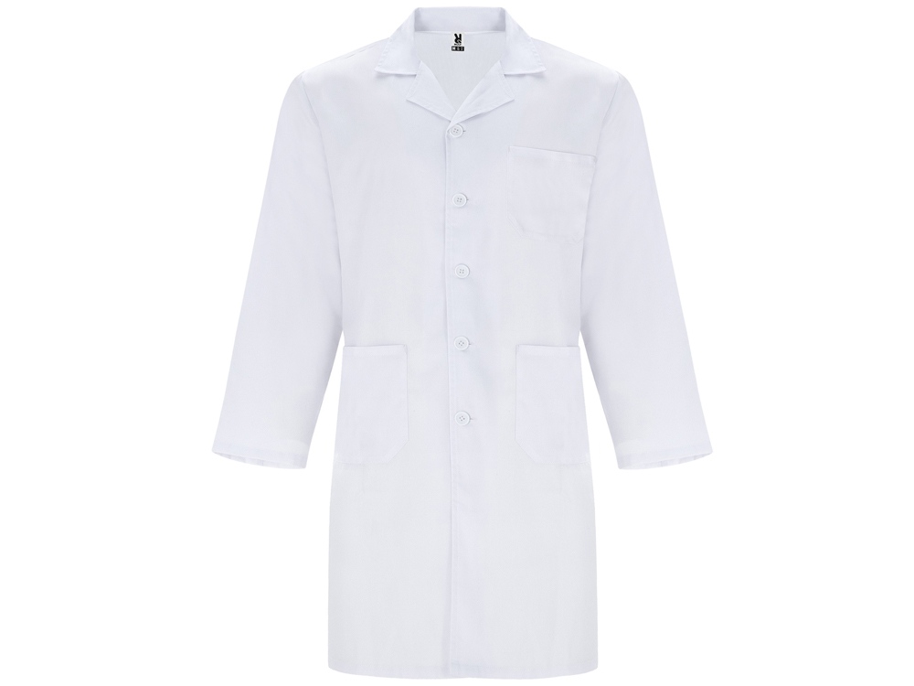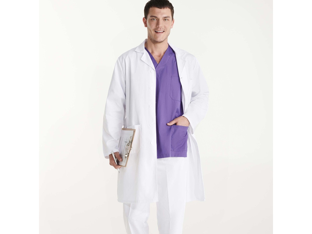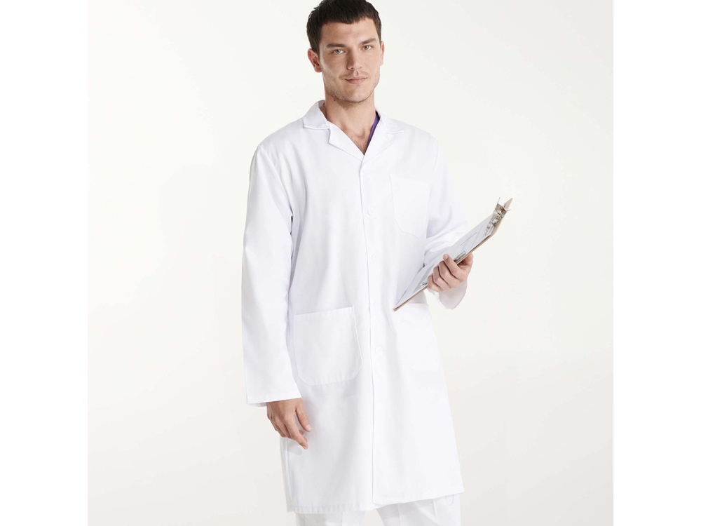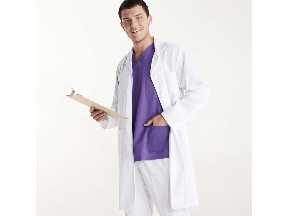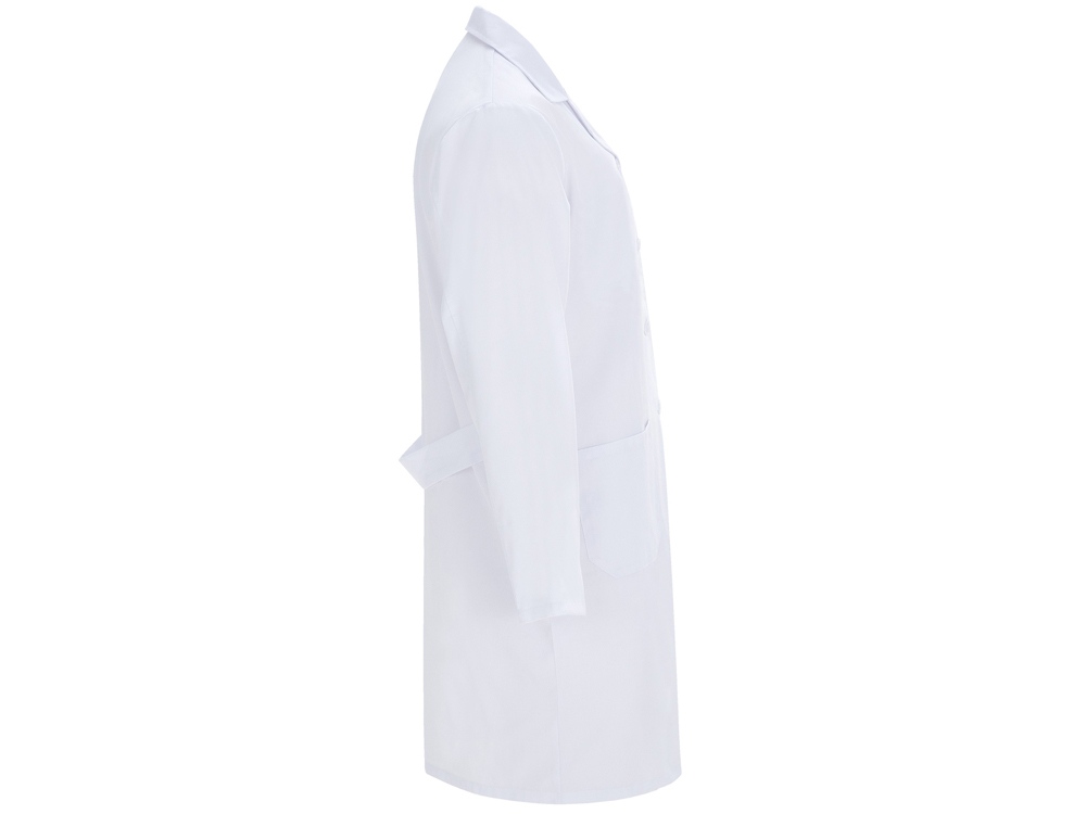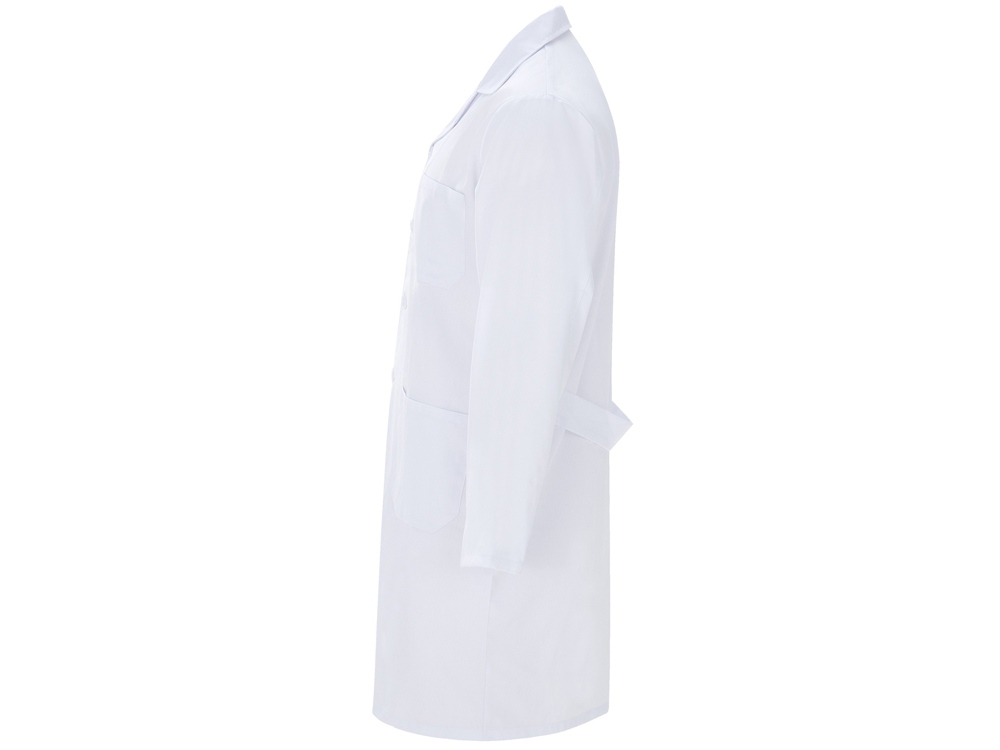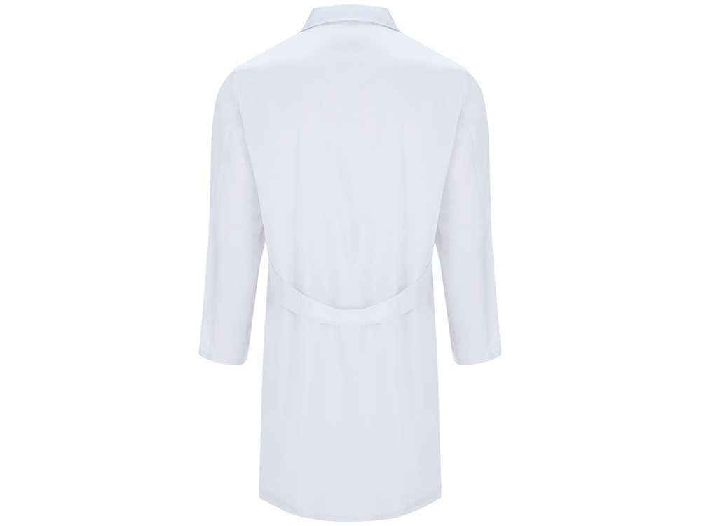 Халат для персонала с длинными рукавами. · Воротник с лацканами. · Центральная застежка на 5 пуговиц в тон. · Один нагрудный карман и два кармана по бокам. · Пояс сзади.