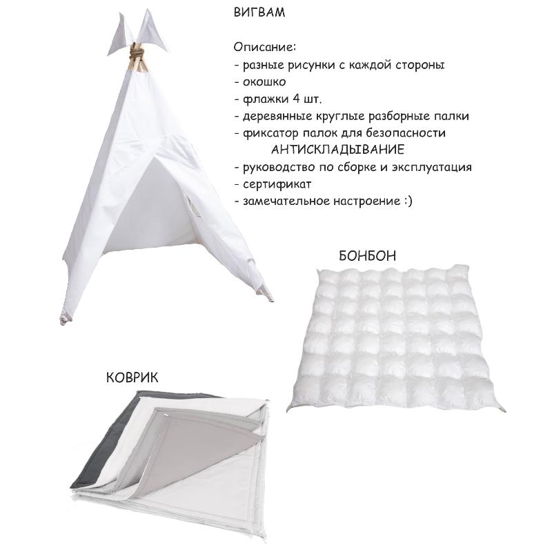 вигвам, коврик, бомбон, и все тканевые изделия – 100% плотность 140 грамм;
