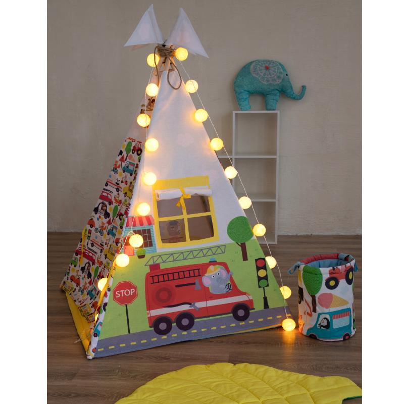 • Игровой вигвам Машинки – это мечта юного автолюбителя. Вход в вигвам выполнен в виде множества детских машинок со зверятами, вторая сторона вигвама – это яркая желтая машинка, проезжающая светофор, на третьей стороне вигвама изображена красная пожарная машина с водителем слонёнком, четвертая сторона демонстрирует проезжую часть с машинками на фоне деревьев и домов.