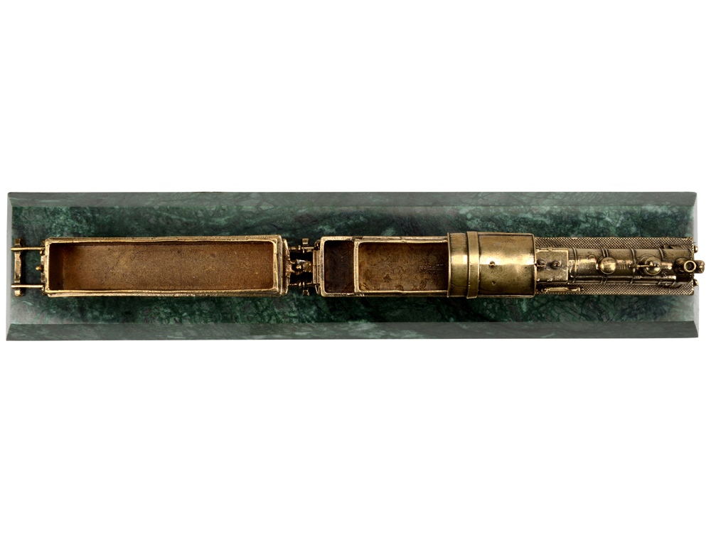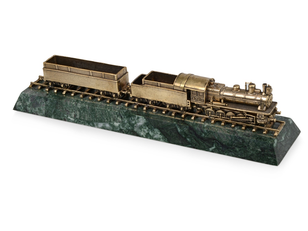 Модель русского и советского грузового паровоза серии Э, который был первым паровозом построенный по схеме 0-5-0 - пять движущихся осей в одной жёсткой раме, не имеющих бегунковых и поддерживающих осей. Первоначально простая и надежная конструкция была разработана Вацлавом Лопушинским. Успех применения данного паровоза обеспечил ему добрую славу и долгую жизнь - он выпускался с 1912 по 1957 г. Модель может использоваться как подарочный настольный набор для руководителя. В вагон можно складывать мелкие канцелярские принадлежности - скрепки, стёрки и т.п.