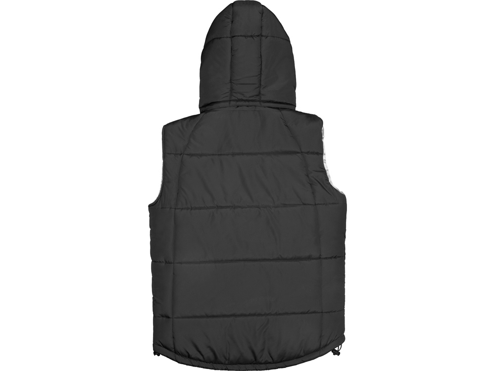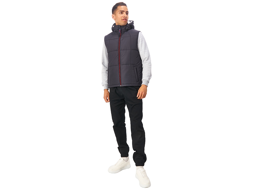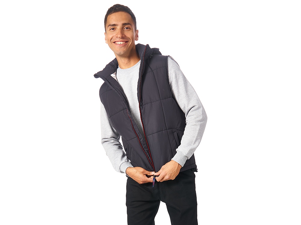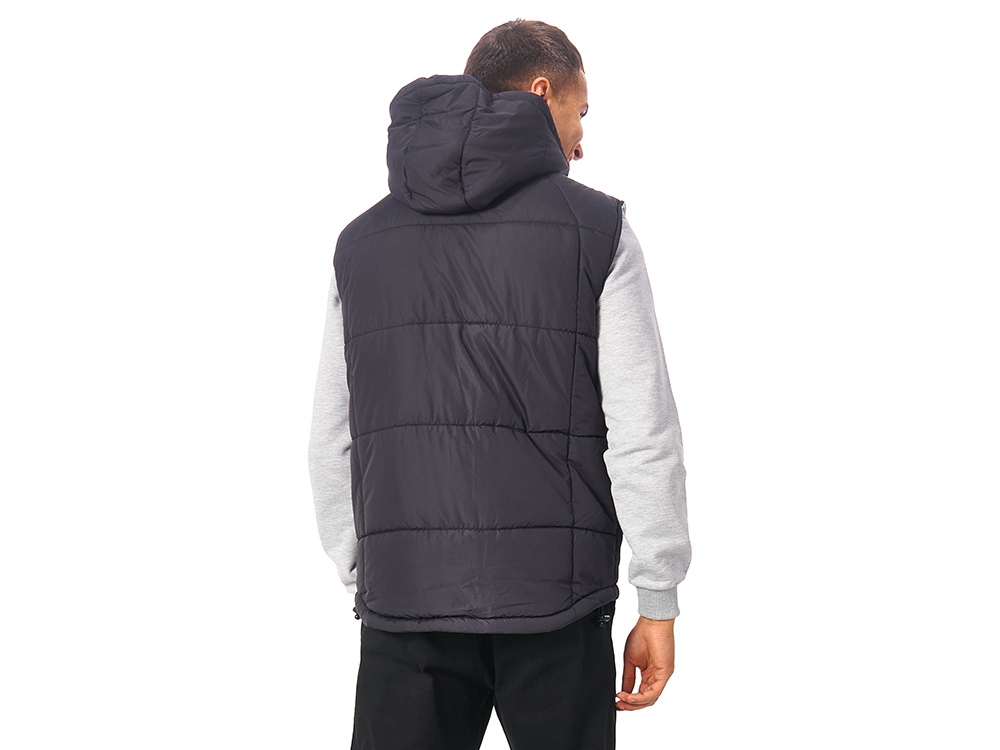 Утепленный жилет для мужчин *центральная молния контрастного цвета *два боковых кармана застегиваются на молнию *большой внутренний карман для документов или денег *контрастная внутренняя подкладка *эластичная кулиска с фиксаторами по низу изделия *задняя часть жилета длиннее передней *съемный капюшон *утеплитель 260гр и в капюшоне 200гр