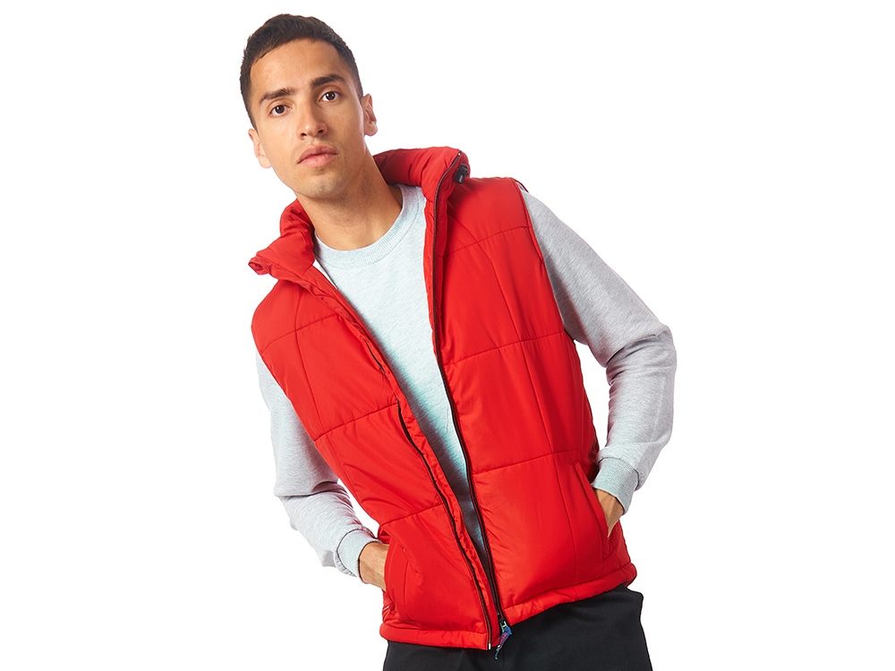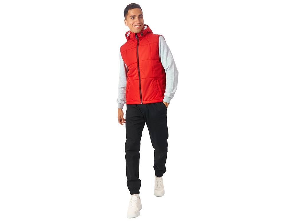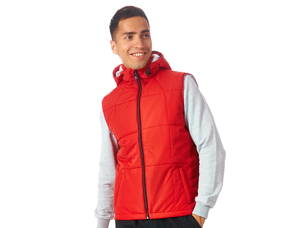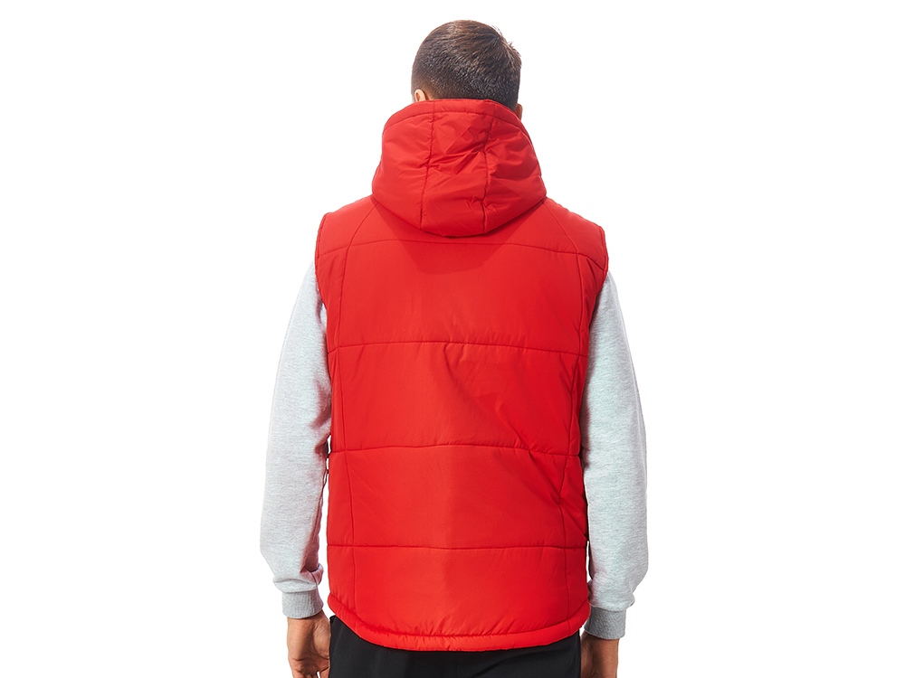 Утепленный жилет для мужчин *центральная молния контрастного цвета *два боковых кармана застегиваются на молнию *большой внутренний карман для документов или денег *контрастная внутренняя подкладка *эластичная кулиска с фиксаторами по низу изделия *задняя часть жилета длиннее передней *съемный капюшон *утеплитель 260гр и в капюшоне 200гр