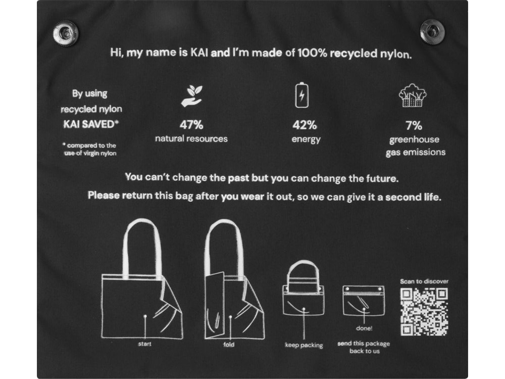 Круглая эко-сумка Kai из переработанного материала, сертифицированного согласно GRS, – самый большой положительный фактор с точки зрения экологических показателей. Более устойчивые исследования начинаются с лучшего дизайна – дизайна, оказывающего меньшее воздействие на окружающую среду. Общее среднее снижение воздействия, уже достигнутое при использовании 1 сумки, составляет: 7 % выбросов углерода, 42 % затрат на энергию и 47 % экологических затрат. Сделанная из переработанного нейлона плотностью 200T, сертифицированного согласно GRS, сумка Kai представляет собой классическую и неустаревающую эко-сумку, подходящую для повседневного использования. Место для печати — на кармане, который одновременно служит чехлом. Сумку можно вернуть с помощью программы возврата с использованием QR-кода, который предоставляет дополнительную информацию.