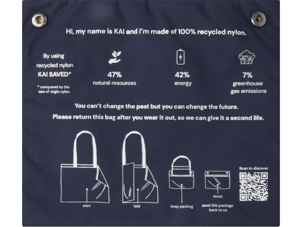 Круглая эко-сумка Kai из переработанного материала, сертифицированного согласно GRS, – самый большой положительный фактор с точки зрения экологических показателей. Более устойчивые исследования начинаются с лучшего дизайна – дизайна, оказывающего меньшее воздействие на окружающую среду. Общее среднее снижение воздействия, уже достигнутое при использовании 1 сумки, составляет: 7 % выбросов углерода, 42 % затрат на энергию и 47 % экологических затрат. Сделанная из переработанного нейлона плотностью 200T, сертифицированного согласно GRS, сумка Kai представляет собой классическую и неустаревающую эко-сумку, подходящую для повседневного использования. Место для печати — на кармане, который одновременно служит чехлом. Сумку можно вернуть с помощью программы возврата с использованием QR-кода, который предоставляет дополнительную информацию.