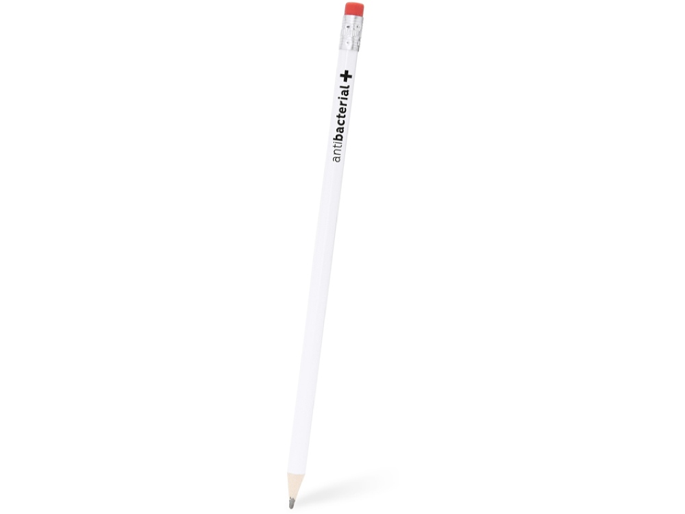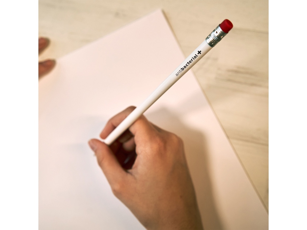 Белый антибактериальный деревянный карандаш с ластиком доступен в различных цветах. На верхней части карандаша нанесен антибактериальный логотип.