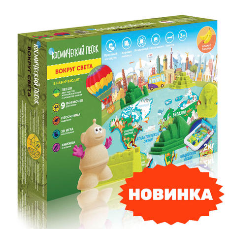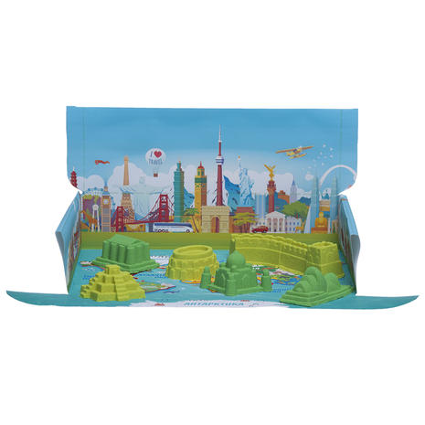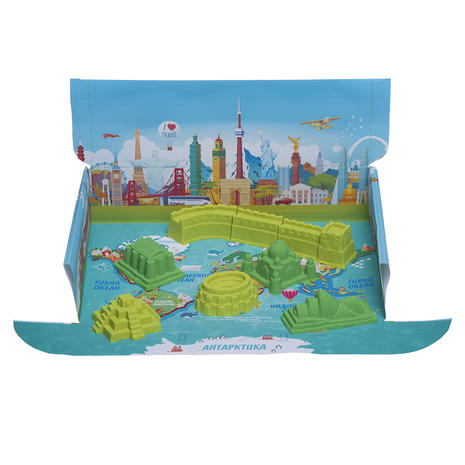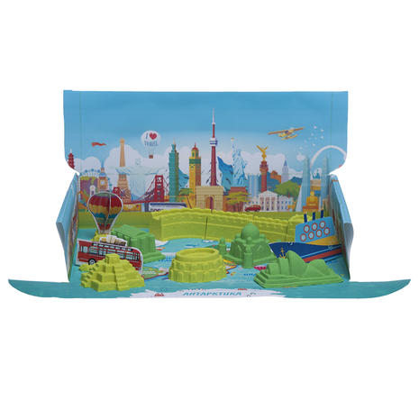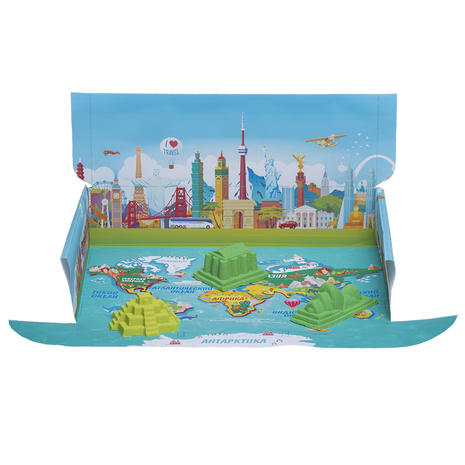 | С помощью тематического набора Космического пластичного песка «Вокруг света» дети могут пуститься в захватывающее воображаемое путешествие прямо у себя дома. Этот набор – прекрасный способ проводить с детьми так популярные сегодня обучающие игровые занятия. Дети смогут не только строить из песка пирамиды, крепости и дворцы, но еще и познакомятся с картой мира, выучат названия некоторых континентов и океанов. | |