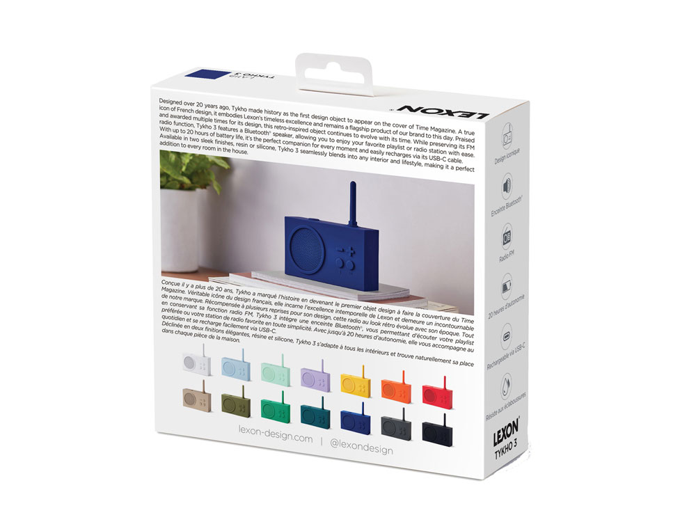 Созданный более 20 лет назад, Tykho вошёл в историю как первый дизайнерский объект, появившийся на обложке престижного журнала Time. Будучи символом французского дизайна, он воплощает непреходящее совершенство Lexon и по сей день остаётся культовым продуктом. Этот культовый радиоприёмник в ретро-стиле, многократно отмеченный наградами за свой дизайн, развивается в ногу со временем. Сохраняя традиционную функциональность FM-радио, Tykho теперь оснащён Bluetooth®-динамиком, что делает его неотъемлемой частью повседневной жизни. - Bluetooth®-динамик с FM-радио - Защита от брызг - Диапазон частот: FM 88 - 108 МГц - Радиус действия Bluetooth®: 10 м - Время работы: 20 ч - Время зарядки: 4 ч - Заряжается через USB-C - кабель в комплекте