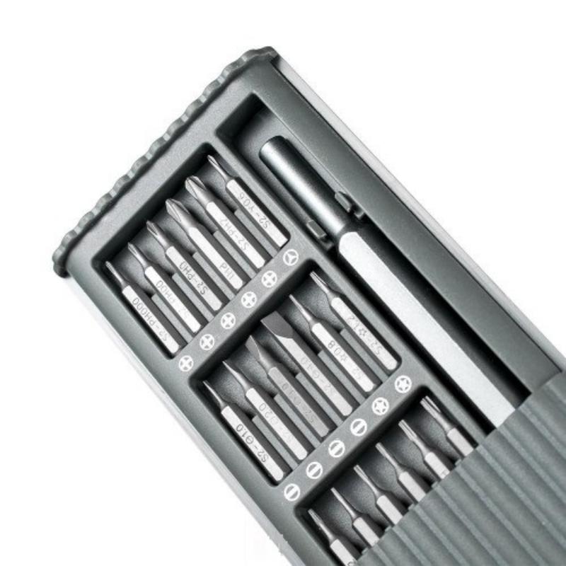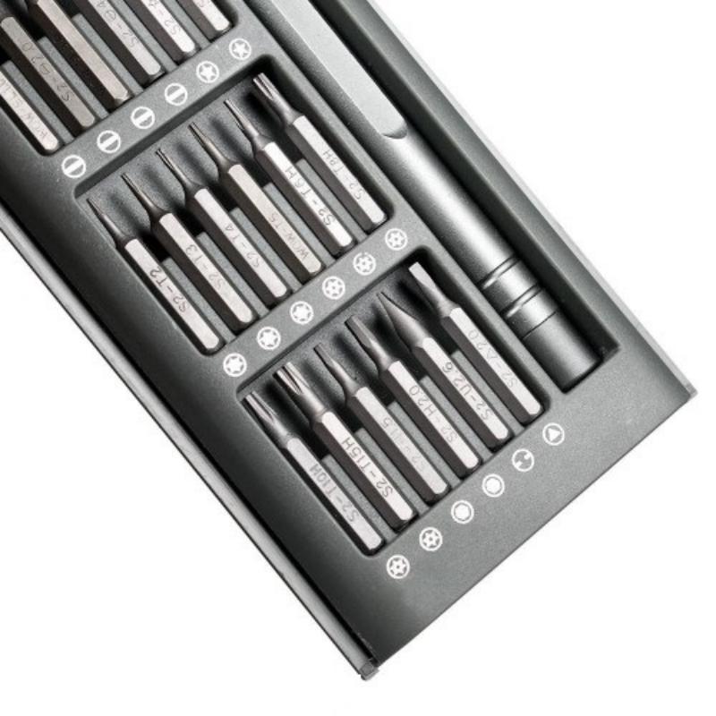 | Набор, включает в себя рукоять и 24 прецизионных биты для различных видов шлицев | PH000; PH00; PH0; PH1; SL1.5; SL2.0; SL2.5; SL3.0; P2; P5; T2; T3; T4; T5H; T6H; T8H; H1.5; H2.0; H2.5; U2.6; Y2.0; Y0.6; △2.3; SIM |