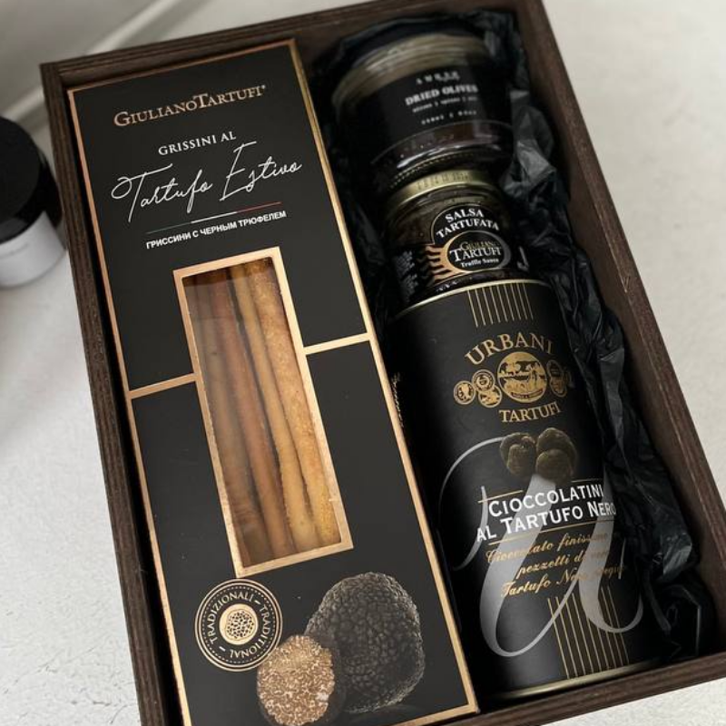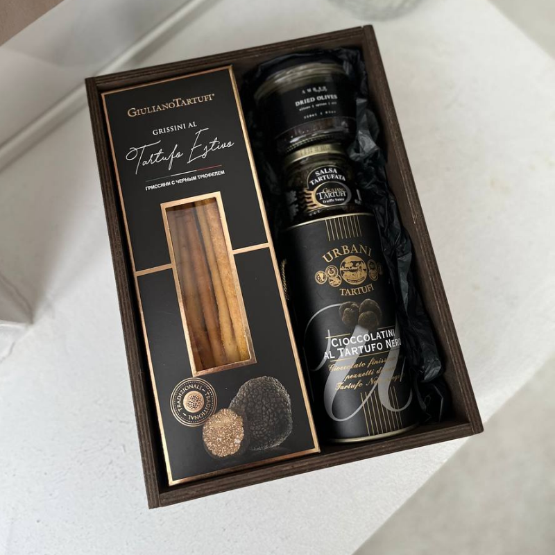 | Состав | Итальянские палочки Гриссини, грибной соус с трюфелем, вяленные оливки крафтового производства, шоколадные конфеты с трюфелем |