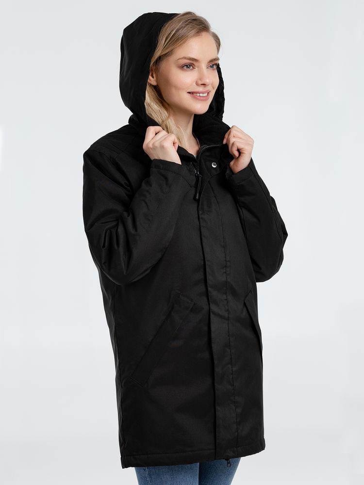 Застежка-молния с двумя замками и планкой на липучках и скрытых кнопках. Капюшон с подкладкой из флиса убирается в воротник. Два внешних кармана на молнии, один внутренний. Регулируемые манжеты на липучках.