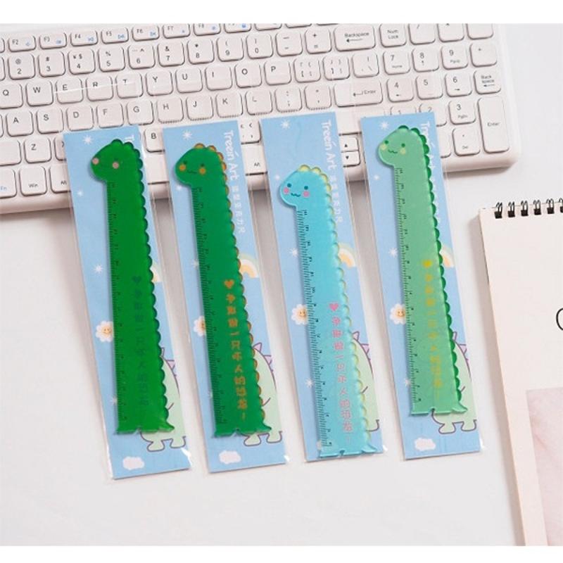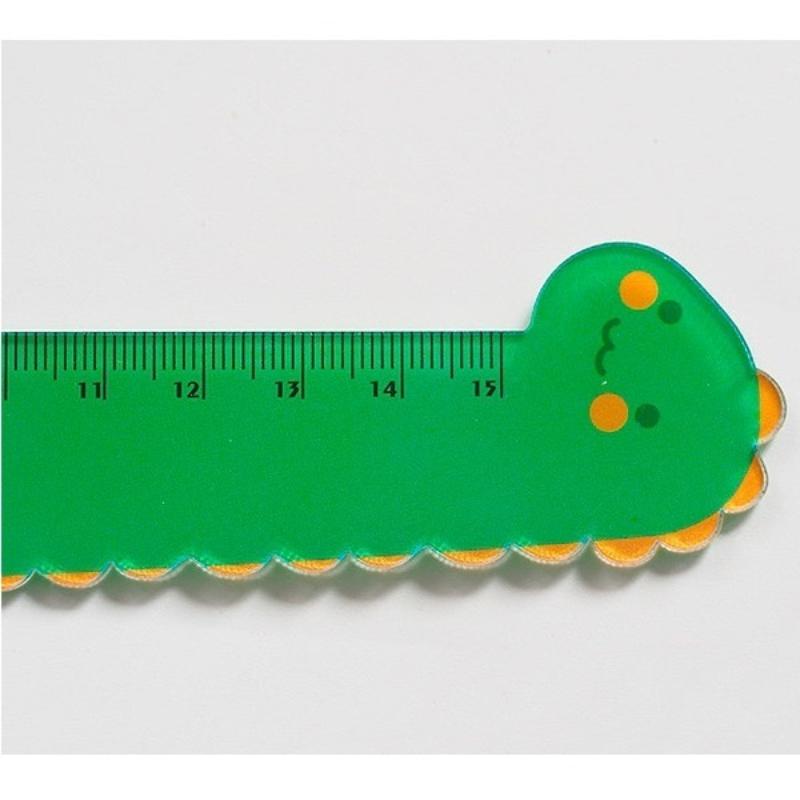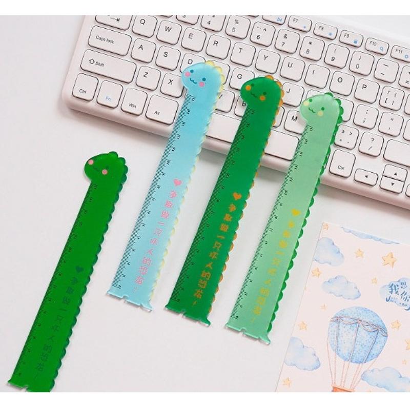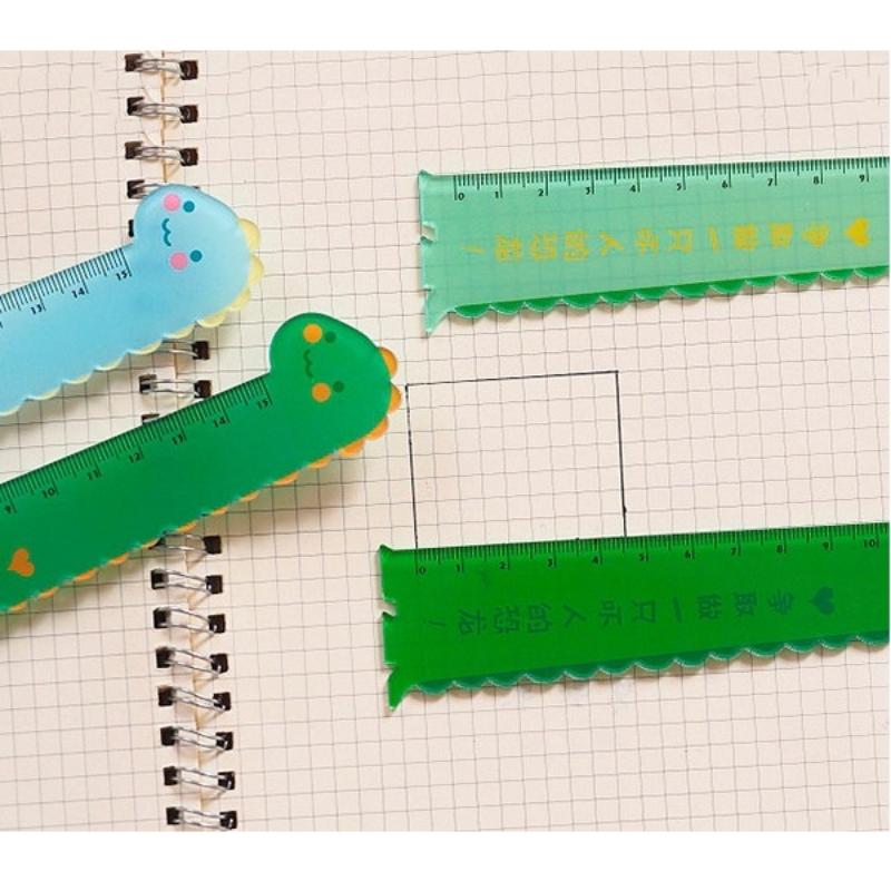Линейка на 15 сантиметров в форме динозаврика. Изготовлена из полупрозрачного пластика.
