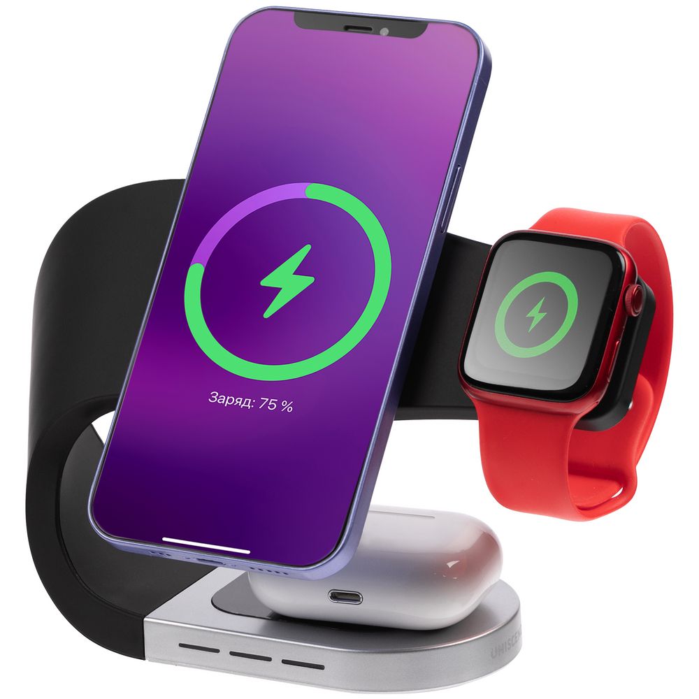 Магнитная зарядная станция может заряжать одновременно 4 устройства: беспроводные наушники (с соответствующей функцией беспроводного заряда), смартфон, часы Apple Watch (2-8) и еще одно любое устройство с помощью USB-кабеля.