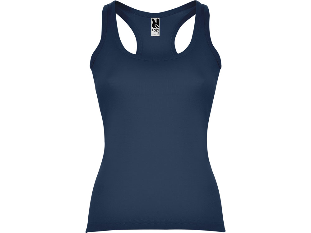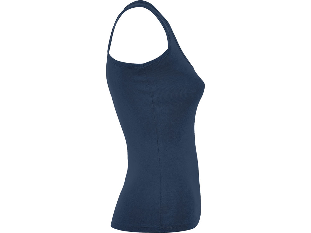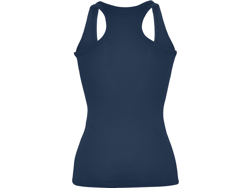 Майка приталенного силуэта с глубоким круглым вырезом горловины. Спортивная спинка, боковые швы.