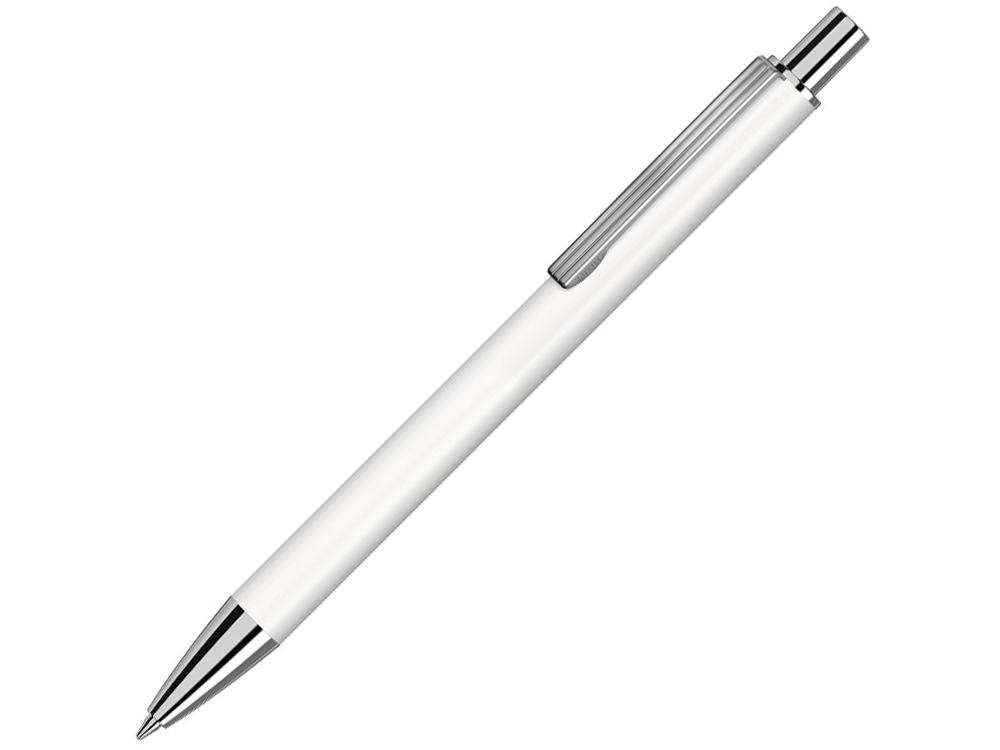 Металлическая автоматическая шариковая ручка с матовой поверхностью, металлическим зажимом, наконечником и кнопкой в сияющем серебре.