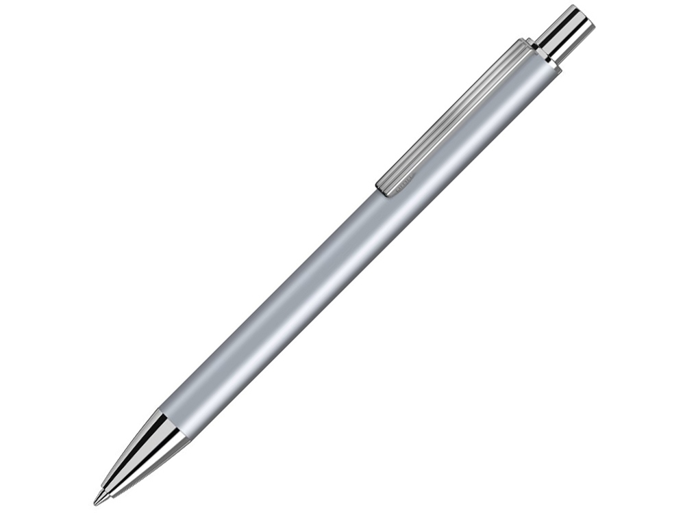 Металлическая автоматическая шариковая ручка с матовой поверхностью, металлическим зажимом, наконечником и кнопкой в сияющем серебре.