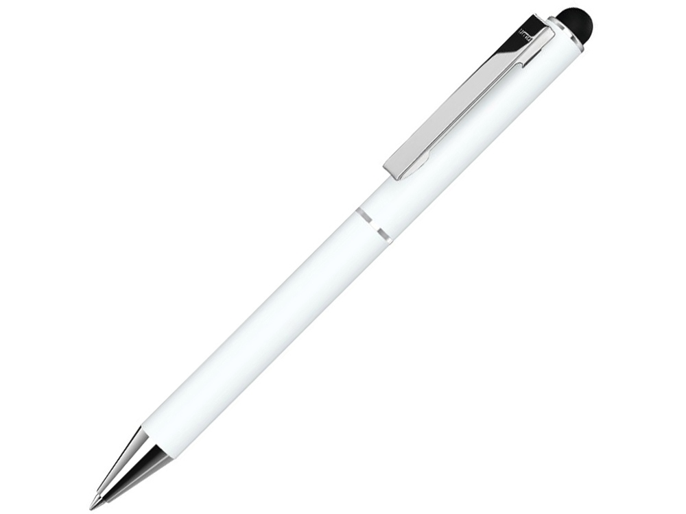 Металлическая шариковая ручка с матовой поверхностью, металлическим клипом, металлическим наконечником и кнопкой с глянцевой серебристой отделкой, прорезиненным ободом для сенсорного регулирования.