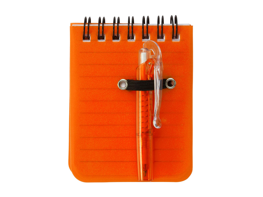 Мини-блокнот на спирали с жесткой полипропиленовой обложкой. 60 листов линованной бумаги. В комплект входит шариковая ручка с синими чернилами.