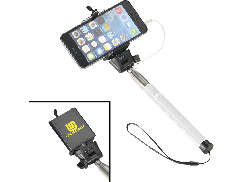 Проводной монопод. Сделайте идеальный селфи с этим выдвижным моноподом (до 90 см). Не требует батареи или использования приложения. Просто подключите 3,5 мм аудио разъем в телефон (совместим только с телефонами, у которых есть разъем 3.5 мм) и нажмите на кнопку, расположенную на ручке. Регулируемый держатель. Силикон, сталь и ПВХ.