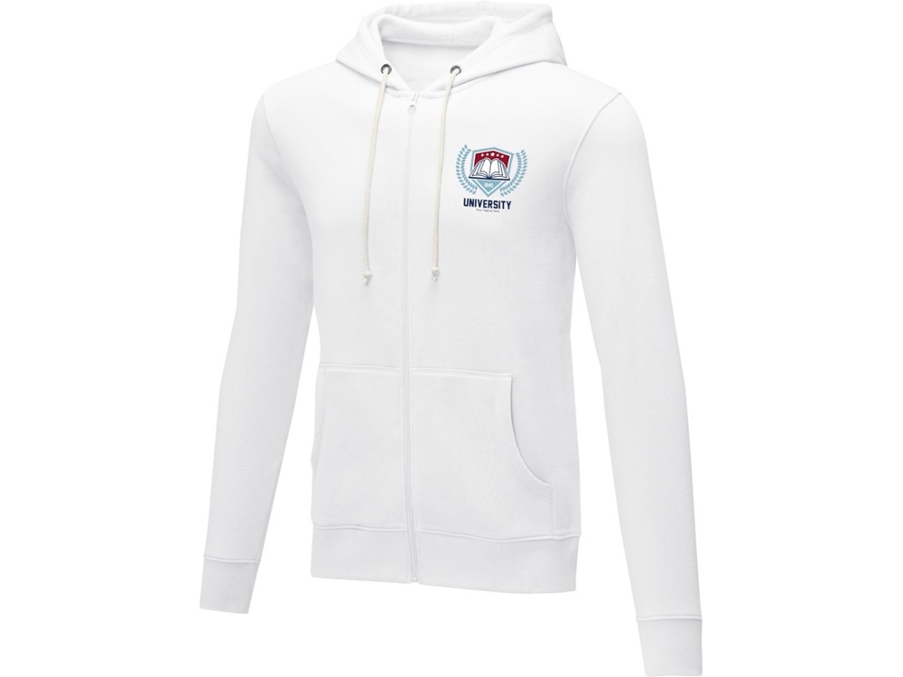 Мужская толстовка на молнии Theron. Основная этикетка, которую можно оторвать или отрезать, без неудобных пришитых ярлыков. Завязки на капюшоне. Расположенная по центру молния. Карман кенгуру. С подшивкой из гладкого трикотажа в рубчик. С манжетами из гладкого трикотажа в рубчик. Внутренняя сторона покрыта ворсом. Тесьма из основного материала по внутренней стороне горловины. Трикотаж 50% Хлопок, 50% Полиэстер, 240 g/m2.