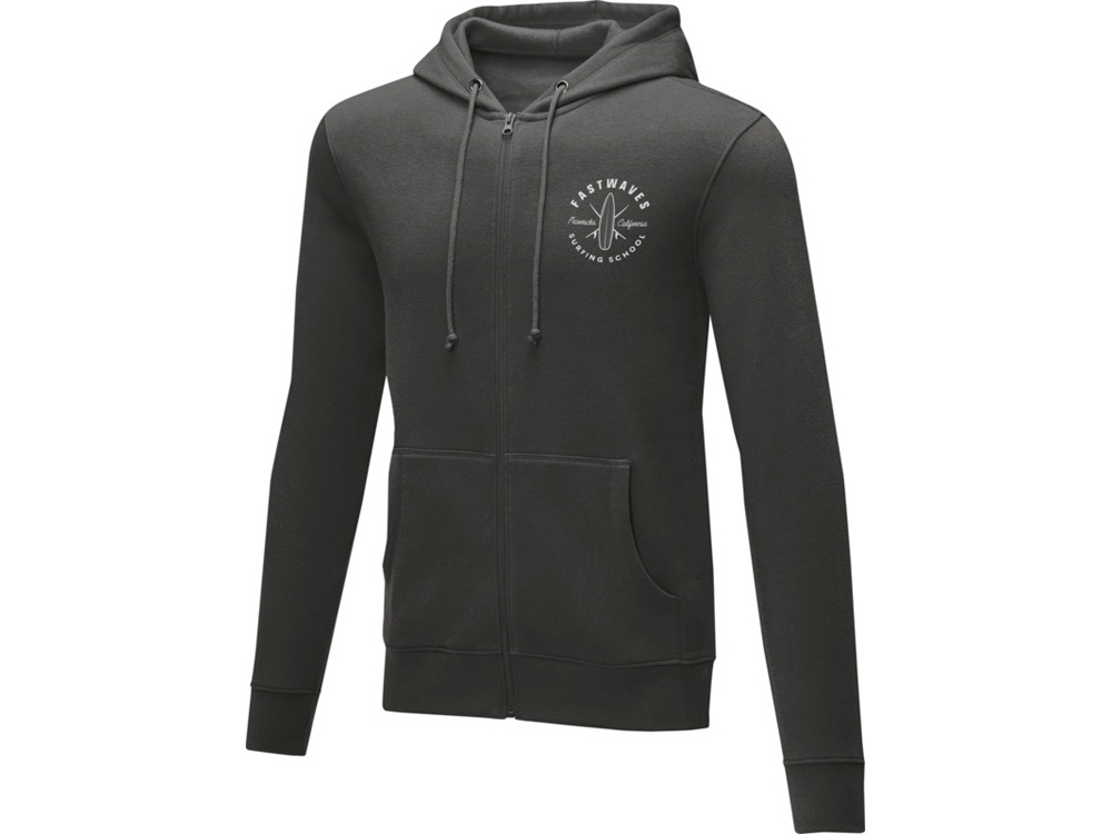 Мужская толстовка на молнии Theron. Основная этикетка, которую можно оторвать или отрезать, без неудобных пришитых ярлыков. Завязки на капюшоне. Расположенная по центру молния. Карман кенгуру. С подшивкой из гладкого трикотажа в рубчик. С манжетами из гладкого трикотажа в рубчик. Внутренняя сторона покрыта ворсом. Тесьма из основного материала по внутренней стороне горловины. Трикотаж 50% Хлопок, 50% Полиэстер, 240 g/m2.