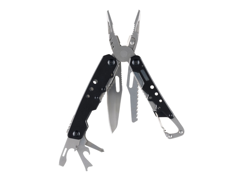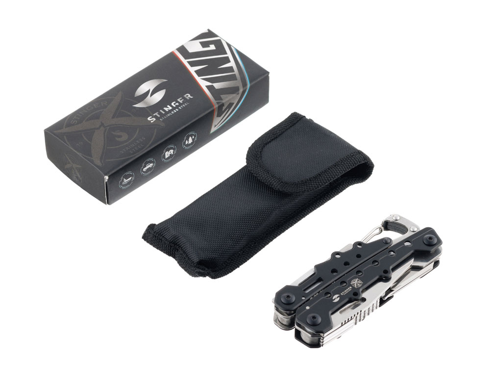 МНОГОФУНКЦИОНАЛЬНЫЙ ИНСТРУМЕНТ STINGER С НАБОРОМ ИЗ 12 ФУНКЦИЙ: 1. Острогубцы 2. Пассатижи 3. Кусачки 4. Лезвие большое плоское 5. Пила по дереву 6. Отвёртка крестовая 7. Отвёртка шлицевая большая 8. Инструмент для снятия изоляции 9. Стропорез 10. Открывалка для бутылок 11. Консервный нож 12. Карабин ХАРАКТЕРИСТИКИ: Материал инструментов: нержавеющая сталь 3Cr13 Материал рукояти: нержавеющая сталь Длина: 105 мм Ширина: 40 мм Вес: 261 г В комплекте: чехол из синтетического материала Упаковка: картонная коробка
